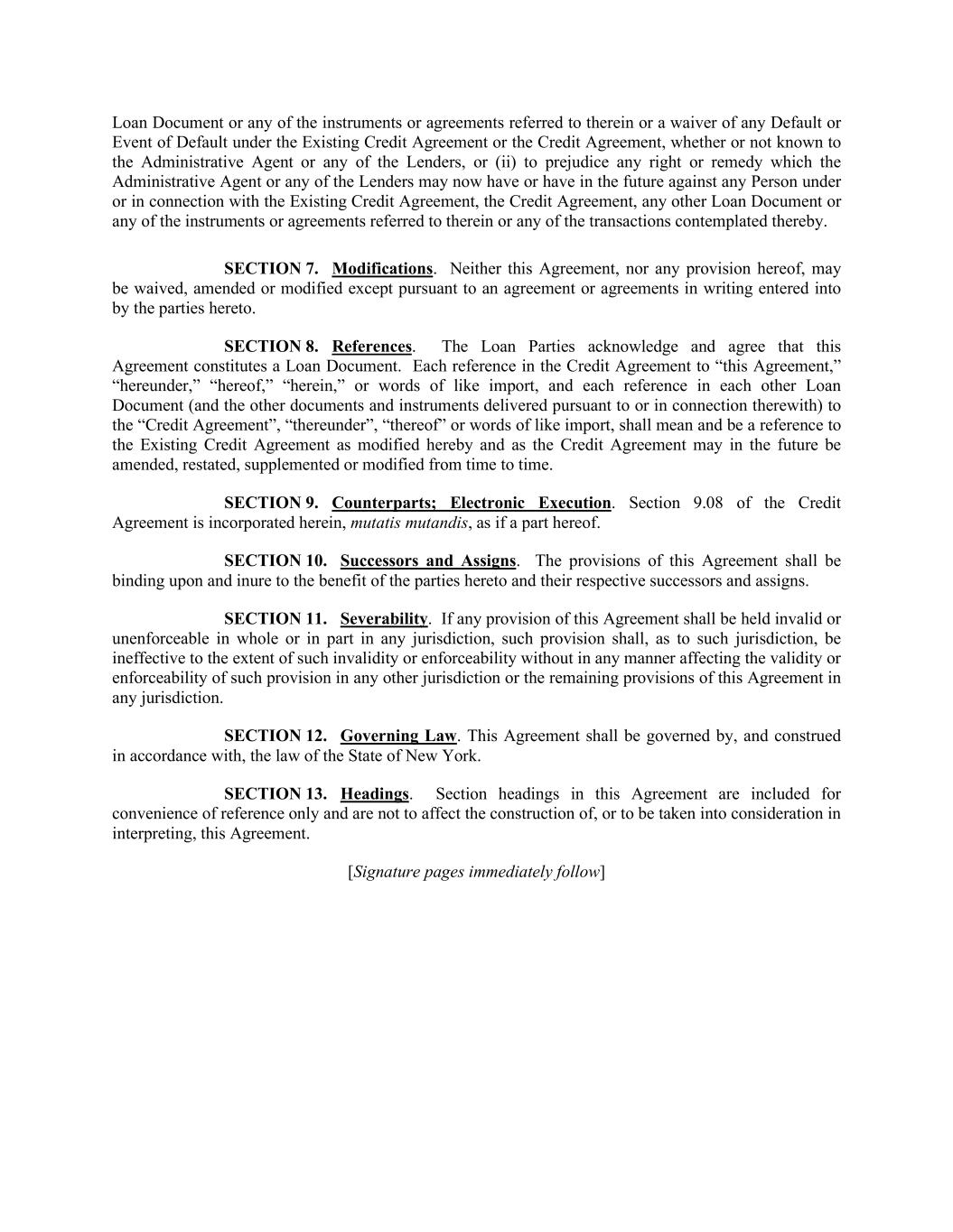 Loan Document or any of the instruments or agreements referred to therein or a waiver of any Default or Event of Default under the Existing Credit Agreement or the Credit Agreement, whether or not known to the Administrative Agent or any of the Lenders, or (ii) to prejudice any right or remedy which the Administrative Agent or any of the Lenders may now have or have in the future against any Person under or in connection with the Existing Credit Agreement, the Credit Agreement, any other Loan Document or any of the instruments or agreements referred to therein or any of the transactions contemplated thereby. SECTION 7. Modifications. Neither this Agreement, nor any provision hereof, may be waived, amended or modified except pursuant to an agreement or agreements in writing entered into by the parties hereto. SECTION 8. References. The Loan Parties acknowledge and agree that this Agreement constitutes a Loan Document. Each reference in the Credit Agreement to “this Agreement,” “hereunder,” “hereof,” “herein,” or words of like import, and each reference in each other Loan Document (and the other documents and instruments delivered pursuant to or in connection therewith) to the “Credit Agreement”, “thereunder”, “thereof” or words of like import, shall mean and be a reference to the Existing Credit Agreement as modified hereby and as the Credit Agreement may in the future be amended, restated, supplemented or modified from time to time. SECTION 9. Counterparts; Electronic Execution. Section 9.08 of the Credit Agreement is incorporated herein, mutatis mutandis, as if a part hereof. SECTION 10. Successors and Assigns. The provisions of this Agreement shall be binding upon and inure to the benefit of the parties hereto and their respective successors and assigns. SECTION 11. Severability. If any provision of this Agreement shall be held invalid or unenforceable in whole or in part in any jurisdiction, such provision shall, as to such jurisdiction, be ineffective to the extent of such invalidity or enforceability without in any manner affecting the validity or enforceability of such provision in any other jurisdiction or the remaining provisions of this Agreement in any jurisdiction. SECTION 12. Governing Law. This Agreement shall be governed by, and construed in accordance with, the law of the State of New York. SECTION 13. Headings. Section headings in this Agreement are included for convenience of reference only and are not to affect the construction of, or to be taken into consideration in interpreting, this Agreement. [Signature pages immediately follow]