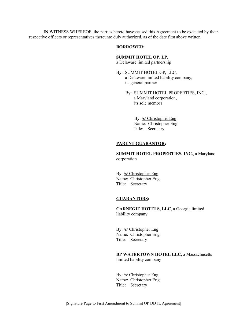 [Signature Page to First Amendment to Summit OP DDTL Agreement] IN WITNESS WHEREOF, the parties hereto have caused this Agreement to be executed by their respective officers or representatives thereunto duly authorized, as of the date first above written. BORROWER: SUMMIT HOTEL OP, LP, a Delaware limited partnership By: SUMMIT HOTEL GP, LLC, a Delaware limited liability company, its general partner By: SUMMIT HOTEL PROPERTIES, INC., a Maryland corporation, its sole member By: /s/ Christopher Eng Name: Christopher Eng Title: Secretary PARENT GUARANTOR: SUMMIT HOTEL PROPERTIES, INC., a Maryland corporation By: /s/ Christopher Eng Name: Christopher Eng Title: Secretary GUARANTORS: CARNEGIE HOTELS, LLC, a Georgia limited liability company By: /s/ Christopher Eng Name: Christopher Eng Title: Secretary BP WATERTOWN HOTEL LLC, a Massachusetts limited liability company By: /s/ Christopher Eng Name: Christopher Eng Title: Secretary