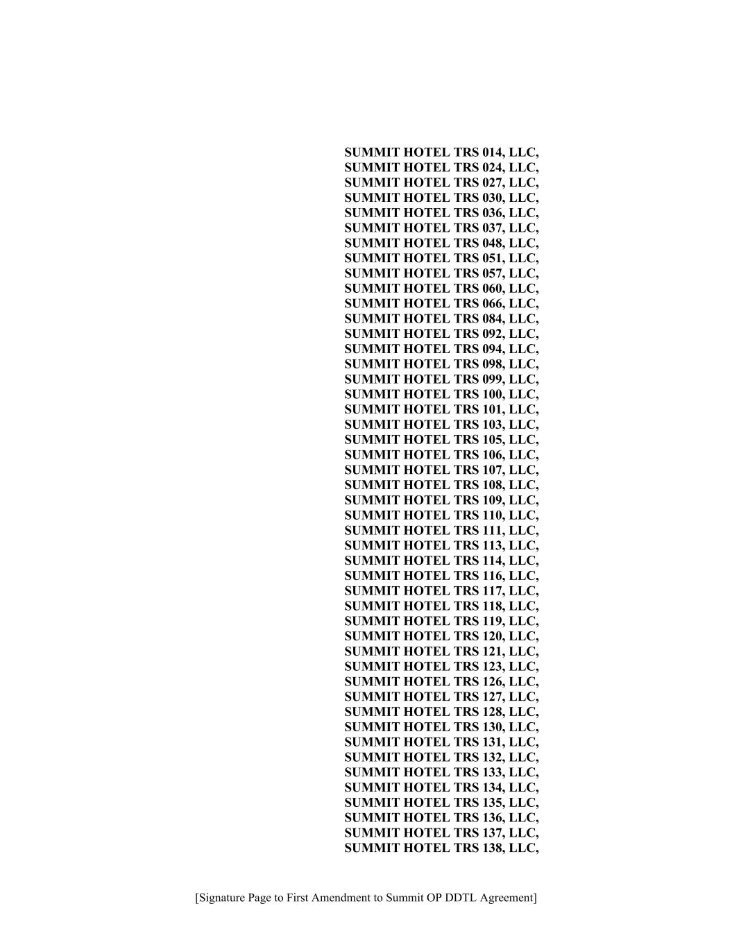 [Signature Page to First Amendment to Summit OP DDTL Agreement] SUMMIT HOTEL TRS 014, LLC, SUMMIT HOTEL TRS 024, LLC, SUMMIT HOTEL TRS 027, LLC, SUMMIT HOTEL TRS 030, LLC, SUMMIT HOTEL TRS 036, LLC, SUMMIT HOTEL TRS 037, LLC, SUMMIT HOTEL TRS 048, LLC, SUMMIT HOTEL TRS 051, LLC, SUMMIT HOTEL TRS 057, LLC, SUMMIT HOTEL TRS 060, LLC, SUMMIT HOTEL TRS 066, LLC, SUMMIT HOTEL TRS 084, LLC, SUMMIT HOTEL TRS 092, LLC, SUMMIT HOTEL TRS 094, LLC, SUMMIT HOTEL TRS 098, LLC, SUMMIT HOTEL TRS 099, LLC, SUMMIT HOTEL TRS 100, LLC, SUMMIT HOTEL TRS 101, LLC, SUMMIT HOTEL TRS 103, LLC, SUMMIT HOTEL TRS 105, LLC, SUMMIT HOTEL TRS 106, LLC, SUMMIT HOTEL TRS 107, LLC, SUMMIT HOTEL TRS 108, LLC, SUMMIT HOTEL TRS 109, LLC, SUMMIT HOTEL TRS 110, LLC, SUMMIT HOTEL TRS 111, LLC, SUMMIT HOTEL TRS 113, LLC, SUMMIT HOTEL TRS 114, LLC, SUMMIT HOTEL TRS 116, LLC, SUMMIT HOTEL TRS 117, LLC, SUMMIT HOTEL TRS 118, LLC, SUMMIT HOTEL TRS 119, LLC, SUMMIT HOTEL TRS 120, LLC, SUMMIT HOTEL TRS 121, LLC, SUMMIT HOTEL TRS 123, LLC, SUMMIT HOTEL TRS 126, LLC, SUMMIT HOTEL TRS 127, LLC, SUMMIT HOTEL TRS 128, LLC, SUMMIT HOTEL TRS 130, LLC, SUMMIT HOTEL TRS 131, LLC, SUMMIT HOTEL TRS 132, LLC, SUMMIT HOTEL TRS 133, LLC, SUMMIT HOTEL TRS 134, LLC, SUMMIT HOTEL TRS 135, LLC, SUMMIT HOTEL TRS 136, LLC, SUMMIT HOTEL TRS 137, LLC, SUMMIT HOTEL TRS 138, LLC,