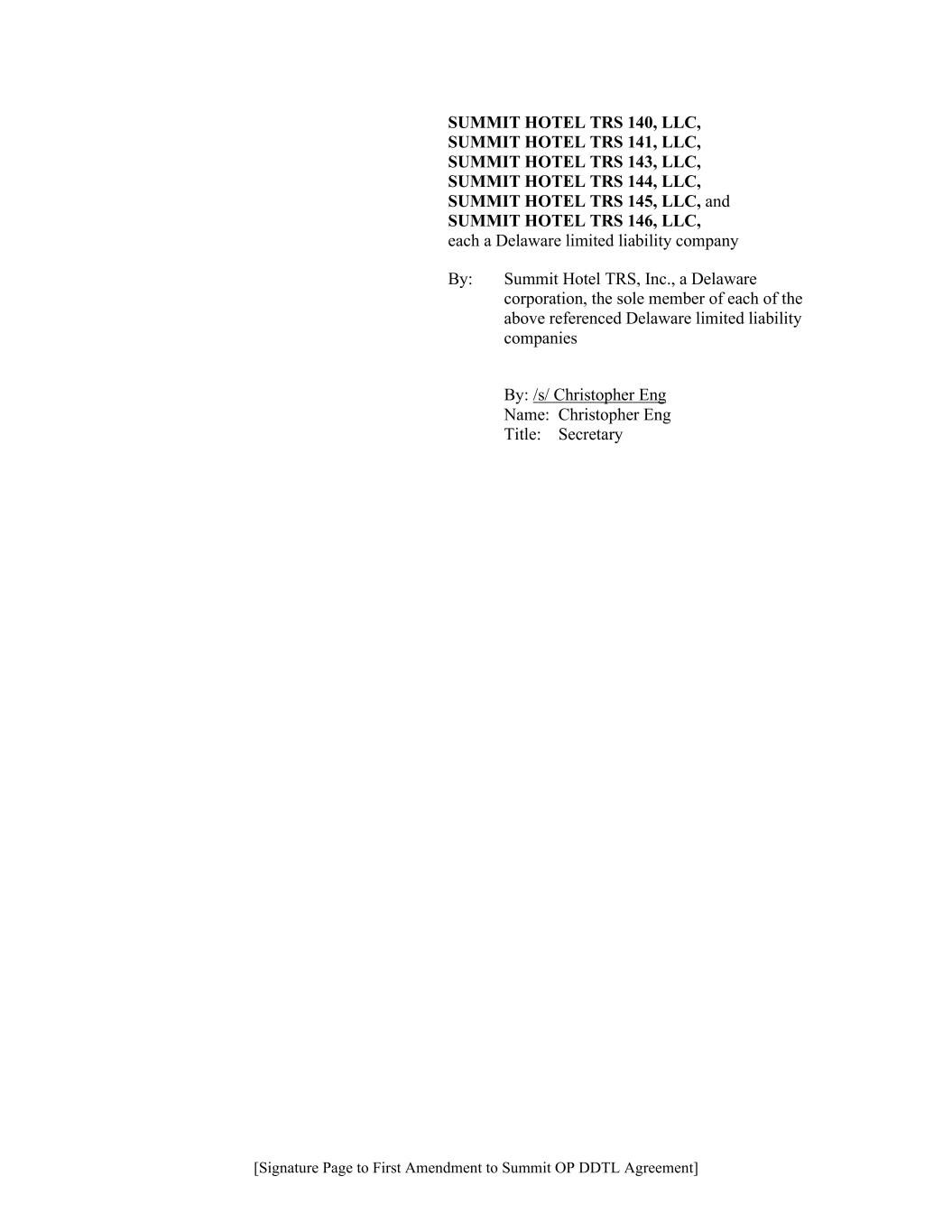 [Signature Page to First Amendment to Summit OP DDTL Agreement] SUMMIT HOTEL TRS 140, LLC, SUMMIT HOTEL TRS 141, LLC, SUMMIT HOTEL TRS 143, LLC, SUMMIT HOTEL TRS 144, LLC, SUMMIT HOTEL TRS 145, LLC, and SUMMIT HOTEL TRS 146, LLC, each a Delaware limited liability company By: Summit Hotel TRS, Inc., a Delaware corporation, the sole member of each of the above referenced Delaware limited liability companies By: /s/ Christopher Eng Name: Christopher Eng Title: Secretary