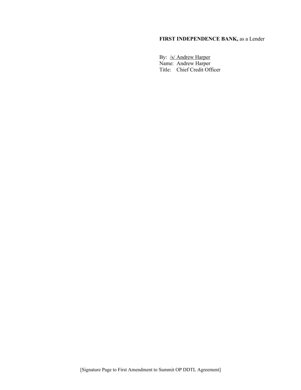 [Signature Page to First Amendment to Summit OP DDTL Agreement] FIRST INDEPENDENCE BANK, as a Lender By: /s/ Andrew Harper Name: Andrew Harper Title: Chief Credit Officer