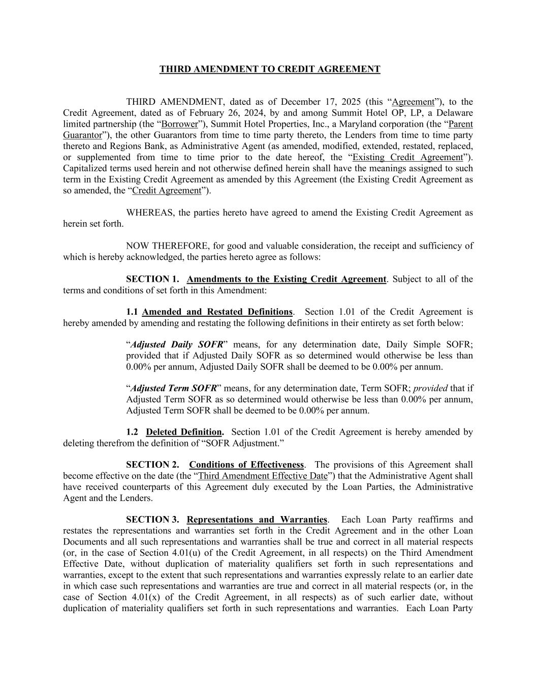 THIRD AMENDMENT TO CREDIT AGREEMENT THIRD AMENDMENT, dated as of December 17, 2025 (this “Agreement”), to the Credit Agreement, dated as of February 26, 2024, by and among Summit Hotel OP, LP, a Delaware limited partnership (the “Borrower”), Summit Hotel Properties, Inc., a Maryland corporation (the “Parent Guarantor”), the other Guarantors from time to time party thereto, the Lenders from time to time party thereto and Regions Bank, as Administrative Agent (as amended, modified, extended, restated, replaced, or supplemented from time to time prior to the date hereof, the “Existing Credit Agreement”). Capitalized terms used herein and not otherwise defined herein shall have the meanings assigned to such term in the Existing Credit Agreement as amended by this Agreement (the Existing Credit Agreement as so amended, the “Credit Agreement”). WHEREAS, the parties hereto have agreed to amend the Existing Credit Agreement as herein set forth. NOW THEREFORE, for good and valuable consideration, the receipt and sufficiency of which is hereby acknowledged, the parties hereto agree as follows: SECTION 1. Amendments to the Existing Credit Agreement. Subject to all of the terms and conditions of set forth in this Amendment: 1.1 Amended and Restated Definitions. Section 1.01 of the Credit Agreement is hereby amended by amending and restating the following definitions in their entirety as set forth below: “Adjusted Daily SOFR” means, for any determination date, Daily Simple SOFR; provided that if Adjusted Daily SOFR as so determined would otherwise be less than 0.00% per annum, Adjusted Daily SOFR shall be deemed to be 0.00% per annum. “Adjusted Term SOFR” means, for any determination date, Term SOFR; provided that if Adjusted Term SOFR as so determined would otherwise be less than 0.00% per annum, Adjusted Term SOFR shall be deemed to be 0.00% per annum. 1.2 Deleted Definition. Section 1.01 of the Credit Agreement is hereby amended by deleting therefrom the definition of “SOFR Adjustment.” SECTION 2. Conditions of Effectiveness. The provisions of this Agreement shall become effective on the date (the “Third Amendment Effective Date”) that the Administrative Agent shall have received counterparts of this Agreement duly executed by the Loan Parties, the Administrative Agent and the Lenders. SECTION 3. Representations and Warranties. Each Loan Party reaffirms and restates the representations and warranties set forth in the Credit Agreement and in the other Loan Documents and all such representations and warranties shall be true and correct in all material respects (or, in the case of Section 4.01(u) of the Credit Agreement, in all respects) on the Third Amendment Effective Date, without duplication of materiality qualifiers set forth in such representations and warranties, except to the extent that such representations and warranties expressly relate to an earlier date in which case such representations and warranties are true and correct in all material respects (or, in the case of Section 4.01(x) of the Credit Agreement, in all respects) as of such earlier date, without duplication of materiality qualifiers set forth in such representations and warranties. Each Loan Party