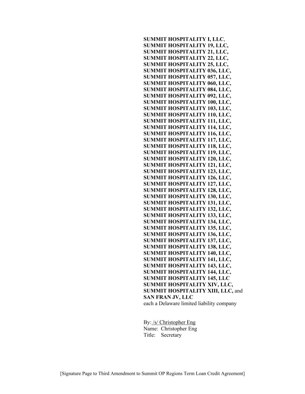 [Signature Page to Third Amendment to Summit OP Regions Term Loan Credit Agreement] SUMMIT HOSPITALITY I, LLC, SUMMIT HOSPITALITY 19, LLC, SUMMIT HOSPITALITY 21, LLC, SUMMIT HOSPITALITY 22, LLC, SUMMIT HOSPITALITY 25, LLC, SUMMIT HOSPITALITY 036, LLC, SUMMIT HOSPITALITY 057, LLC, SUMMIT HOSPITALITY 060, LLC, SUMMIT HOSPITALITY 084, LLC, SUMMIT HOSPITALITY 092, LLC, SUMMIT HOSPITALITY 100, LLC, SUMMIT HOSPITALITY 103, LLC, SUMMIT HOSPITALITY 110, LLC, SUMMIT HOSPITALITY 111, LLC, SUMMIT HOSPITALITY 114, LLC, SUMMIT HOSPITALITY 116, LLC, SUMMIT HOSPITALITY 117, LLC, SUMMIT HOSPITALITY 118, LLC, SUMMIT HOSPITALITY 119, LLC, SUMMIT HOSPITALITY 120, LLC, SUMMIT HOSPITALITY 121, LLC, SUMMIT HOSPITALITY 123, LLC, SUMMIT HOSPITALITY 126, LLC, SUMMIT HOSPITALITY 127, LLC, SUMMIT HOSPITALITY 128, LLC, SUMMIT HOSPITALITY 130, LLC, SUMMIT HOSPITALITY 131, LLC, SUMMIT HOSPITALITY 132, LLC, SUMMIT HOSPITALITY 133, LLC, SUMMIT HOSPITALITY 134, LLC, SUMMIT HOSPITALITY 135, LLC, SUMMIT HOSPITALITY 136, LLC, SUMMIT HOSPITALITY 137, LLC, SUMMIT HOSPITALITY 138, LLC, SUMMIT HOSPITALITY 140, LLC, SUMMIT HOSPITALITY 141, LLC, SUMMIT HOSPITALITY 143, LLC, SUMMIT HOSPITALITY 144, LLC, SUMMIT HOSPITALITY 145, LLC SUMMIT HOSPITALITY XIV, LLC, SUMMIT HOSPITALITY XIII, LLC, and SAN FRAN JV, LLC each a Delaware limited liability company By: /s/ Christopher Eng Name: Christopher Eng Title: Secretary