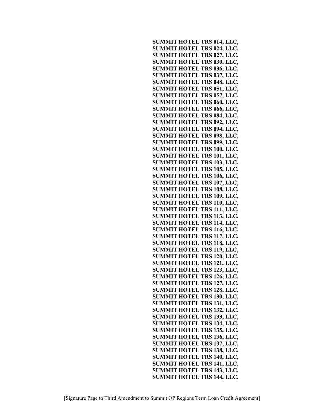 [Signature Page to Third Amendment to Summit OP Regions Term Loan Credit Agreement] SUMMIT HOTEL TRS 014, LLC, SUMMIT HOTEL TRS 024, LLC, SUMMIT HOTEL TRS 027, LLC, SUMMIT HOTEL TRS 030, LLC, SUMMIT HOTEL TRS 036, LLC, SUMMIT HOTEL TRS 037, LLC, SUMMIT HOTEL TRS 048, LLC, SUMMIT HOTEL TRS 051, LLC, SUMMIT HOTEL TRS 057, LLC, SUMMIT HOTEL TRS 060, LLC, SUMMIT HOTEL TRS 066, LLC, SUMMIT HOTEL TRS 084, LLC, SUMMIT HOTEL TRS 092, LLC, SUMMIT HOTEL TRS 094, LLC, SUMMIT HOTEL TRS 098, LLC, SUMMIT HOTEL TRS 099, LLC, SUMMIT HOTEL TRS 100, LLC, SUMMIT HOTEL TRS 101, LLC, SUMMIT HOTEL TRS 103, LLC, SUMMIT HOTEL TRS 105, LLC, SUMMIT HOTEL TRS 106, LLC, SUMMIT HOTEL TRS 107, LLC, SUMMIT HOTEL TRS 108, LLC, SUMMIT HOTEL TRS 109, LLC, SUMMIT HOTEL TRS 110, LLC, SUMMIT HOTEL TRS 111, LLC, SUMMIT HOTEL TRS 113, LLC, SUMMIT HOTEL TRS 114, LLC, SUMMIT HOTEL TRS 116, LLC, SUMMIT HOTEL TRS 117, LLC, SUMMIT HOTEL TRS 118, LLC, SUMMIT HOTEL TRS 119, LLC, SUMMIT HOTEL TRS 120, LLC, SUMMIT HOTEL TRS 121, LLC, SUMMIT HOTEL TRS 123, LLC, SUMMIT HOTEL TRS 126, LLC, SUMMIT HOTEL TRS 127, LLC, SUMMIT HOTEL TRS 128, LLC, SUMMIT HOTEL TRS 130, LLC, SUMMIT HOTEL TRS 131, LLC, SUMMIT HOTEL TRS 132, LLC, SUMMIT HOTEL TRS 133, LLC, SUMMIT HOTEL TRS 134, LLC, SUMMIT HOTEL TRS 135, LLC, SUMMIT HOTEL TRS 136, LLC, SUMMIT HOTEL TRS 137, LLC, SUMMIT HOTEL TRS 138, LLC, SUMMIT HOTEL TRS 140, LLC, SUMMIT HOTEL TRS 141, LLC, SUMMIT HOTEL TRS 143, LLC, SUMMIT HOTEL TRS 144, LLC,