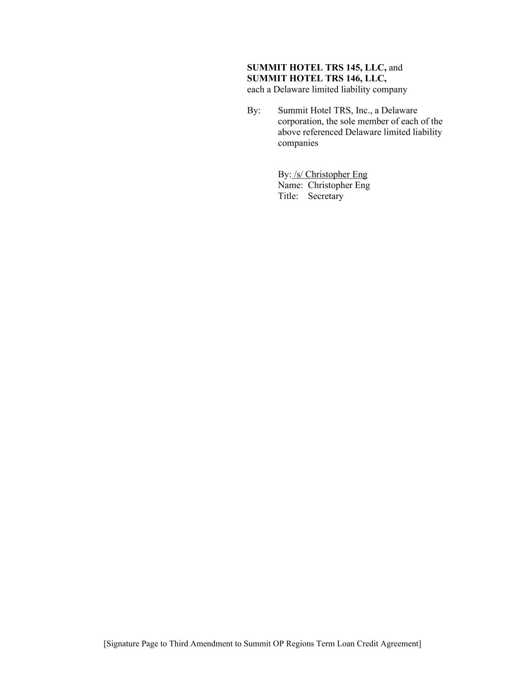 [Signature Page to Third Amendment to Summit OP Regions Term Loan Credit Agreement] SUMMIT HOTEL TRS 145, LLC, and SUMMIT HOTEL TRS 146, LLC, each a Delaware limited liability company By: Summit Hotel TRS, Inc., a Delaware corporation, the sole member of each of the above referenced Delaware limited liability companies By: /s/ Christopher Eng Name: Christopher Eng Title: Secretary