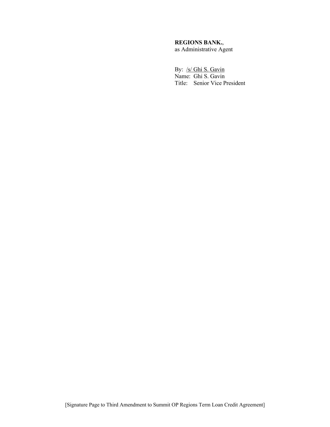 [Signature Page to Third Amendment to Summit OP Regions Term Loan Credit Agreement] REGIONS BANK., as Administrative Agent By: /s/ Ghi S. Gavin Name: Ghi S. Gavin Title: Senior Vice President