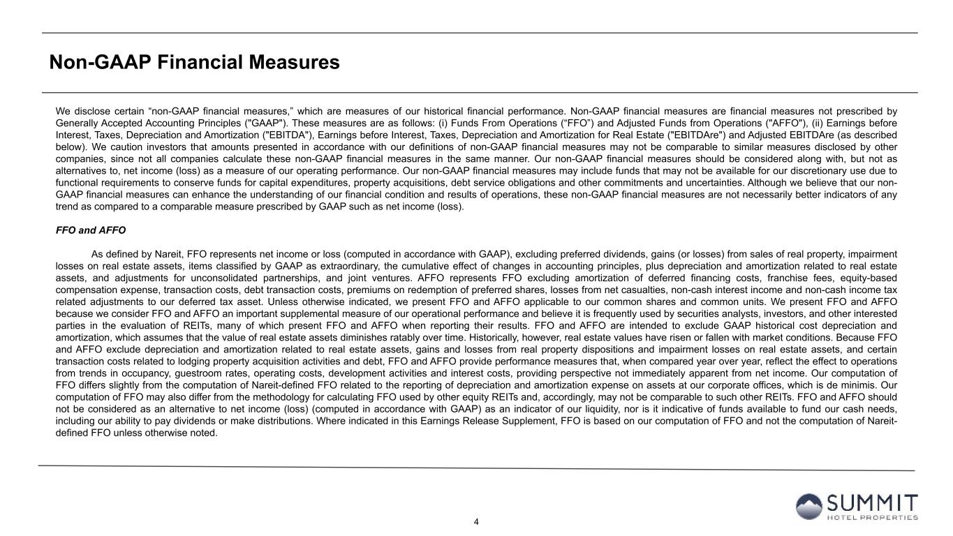 3 Forward-Looking Statements We make forward-looking statements in this presentation that are subject to risks and uncertainties. These forward-looking statements include information about possible or assumed future results of our business, financial condition, liquidity, results of operations, plans, and objectives. When we use the words “believe,” “expect,” “anticipate,” “estimate,” “plan,” “continue,” “intend,” “should,” “may,” or similar expressions, we intend to identify forward-looking statements. Statements regarding the following subjects, among others, may be forward-looking by their nature: • our ability to increase our dividend per share of common stock; • the state of the U.S. economy generally or in specific geographic regions in which we operate, and the effect of general economic conditions on the lodging industry and our business in particular; • market trends in our industry, interest rates, real estate values and the capital markets; • our business and investment strategy and, particularly, our ability to identify and complete hotel acquisitions and dispositions; • our projected operating results; • actions and initiatives of the U.S. government and changes to U.S. government policies and the execution and impact of such actions, initiatives and policies; • our ability to manage our relationships with our management companies and franchisors; • our ability to maintain our existing and future financing arrangements; • changes in the value of our properties; • the impact of and changes in governmental regulations, tax law and rates, accounting guidance and similar matters; • our ability to satisfy the requirements for qualification as a REIT under the U.S. Tax Code; • our ability to repay or refinance our indebtedness as it matures or becomes callable by lenders; • the availability of qualified personnel; • our ability to make distributions to our stockholders in the future; • the general volatility of the market price of our securities; and • the degree and nature of our competition. Forward-looking statements are based on our beliefs, assumptions and expectations of our future performance, taking into account information currently available to us. You should not place undue reliance on these forward-looking statements. These beliefs, assumptions and expectations can change as a result of many possible events or factors, not all of which are known to us. These factors are discussed under “Item 1A. Risk Factors” in our Annual Report on Form 10-K for the year ended December 31, 2025, and in other documents we have filed with the Securities and Exchange Commission. If a change occurs, our business, financial condition, liquidity and results of operations may vary materially from those expressed in our forward-looking statements. Any forward-looking statement is effective only as of the date on which it is made. New risks and uncertainties arise over time, and it is not possible for us to predict those events or how they may affect us. Except as required by law we are not obligated to, and do not intend to, publicly update or revise any forward-looking statements, whether as a result of new information, future events or otherwise. Additionally, this presentation contains certain unaudited historical and pro forma information and metrics which are based or calculated from historical data that is maintained or produced by Summit Hotel Properties, Inc. or third parties. This presentation contain statistics and other data that may have been obtained from, or compiled from, information made available by third-parties.