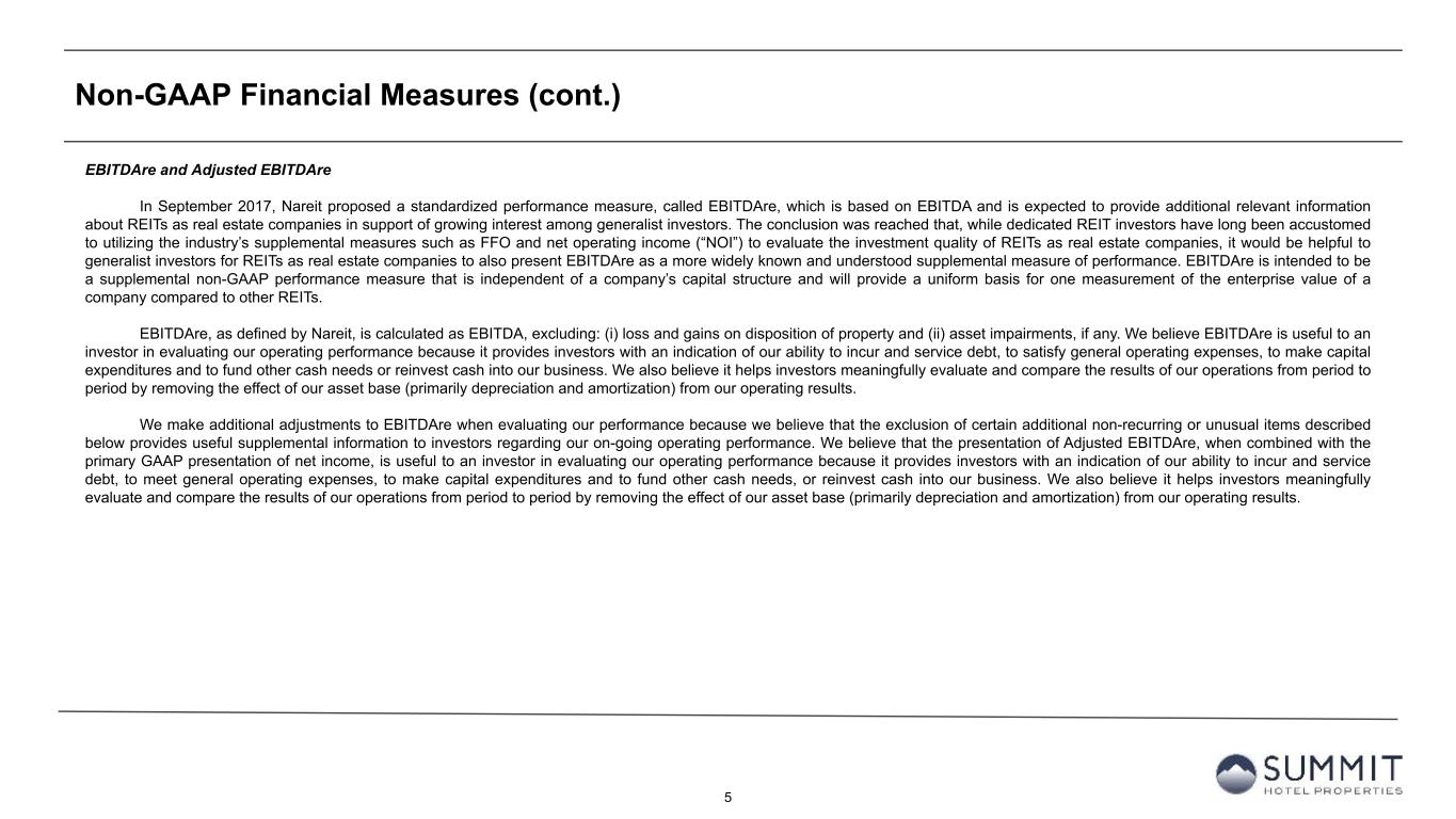 4 Non-GAAP Financial Measures We disclose certain “non-GAAP financial measures,” which are measures of our historical financial performance. Non-GAAP financial measures are financial measures not prescribed by Generally Accepted Accounting Principles ("GAAP"). These measures are as follows: (i) Funds From Operations (“FFO”) and Adjusted Funds from Operations ("AFFO"), (ii) Earnings before Interest, Taxes, Depreciation and Amortization ("EBITDA"), Earnings before Interest, Taxes, Depreciation and Amortization for Real Estate ("EBITDAre") and Adjusted EBITDAre (as described below). We caution investors that amounts presented in accordance with our definitions of non-GAAP financial measures may not be comparable to similar measures disclosed by other companies, since not all companies calculate these non-GAAP financial measures in the same manner. Our non-GAAP financial measures should be considered along with, but not as alternatives to, net income (loss) as a measure of our operating performance. Our non-GAAP financial measures may include funds that may not be available for our discretionary use due to functional requirements to conserve funds for capital expenditures, property acquisitions, debt service obligations and other commitments and uncertainties. Although we believe that our non- GAAP financial measures can enhance the understanding of our financial condition and results of operations, these non-GAAP financial measures are not necessarily better indicators of any trend as compared to a comparable measure prescribed by GAAP such as net income (loss). FFO and AFFO As defined by Nareit, FFO represents net income or loss (computed in accordance with GAAP), excluding preferred dividends, gains (or losses) from sales of real property, impairment losses on real estate assets, items classified by GAAP as extraordinary, the cumulative effect of changes in accounting principles, plus depreciation and amortization related to real estate assets, and adjustments for unconsolidated partnerships, and joint ventures. AFFO represents FFO excluding amortization of deferred financing costs, franchise fees, equity-based compensation expense, transaction costs, debt transaction costs, premiums on redemption of preferred shares, losses from net casualties, non-cash interest income and non-cash income tax related adjustments to our deferred tax asset. Unless otherwise indicated, we present FFO and AFFO applicable to our common shares and common units. We present FFO and AFFO because we consider FFO and AFFO an important supplemental measure of our operational performance and believe it is frequently used by securities analysts, investors, and other interested parties in the evaluation of REITs, many of which present FFO and AFFO when reporting their results. FFO and AFFO are intended to exclude GAAP historical cost depreciation and amortization, which assumes that the value of real estate assets diminishes ratably over time. Historically, however, real estate values have risen or fallen with market conditions. Because FFO and AFFO exclude depreciation and amortization related to real estate assets, gains and losses from real property dispositions and impairment losses on real estate assets, and certain transaction costs related to lodging property acquisition activities and debt, FFO and AFFO provide performance measures that, when compared year over year, reflect the effect to operations from trends in occupancy, guestroom rates, operating costs, development activities and interest costs, providing perspective not immediately apparent from net income. Our computation of FFO differs slightly from the computation of Nareit-defined FFO related to the reporting of depreciation and amortization expense on assets at our corporate offices, which is de minimis. Our computation of FFO may also differ from the methodology for calculating FFO used by other equity REITs and, accordingly, may not be comparable to such other REITs. FFO and AFFO should not be considered as an alternative to net income (loss) (computed in accordance with GAAP) as an indicator of our liquidity, nor is it indicative of funds available to fund our cash needs, including our ability to pay dividends or make distributions. Where indicated in this Earnings Release Supplement, FFO is based on our computation of FFO and not the computation of Nareit- defined FFO unless otherwise noted.
