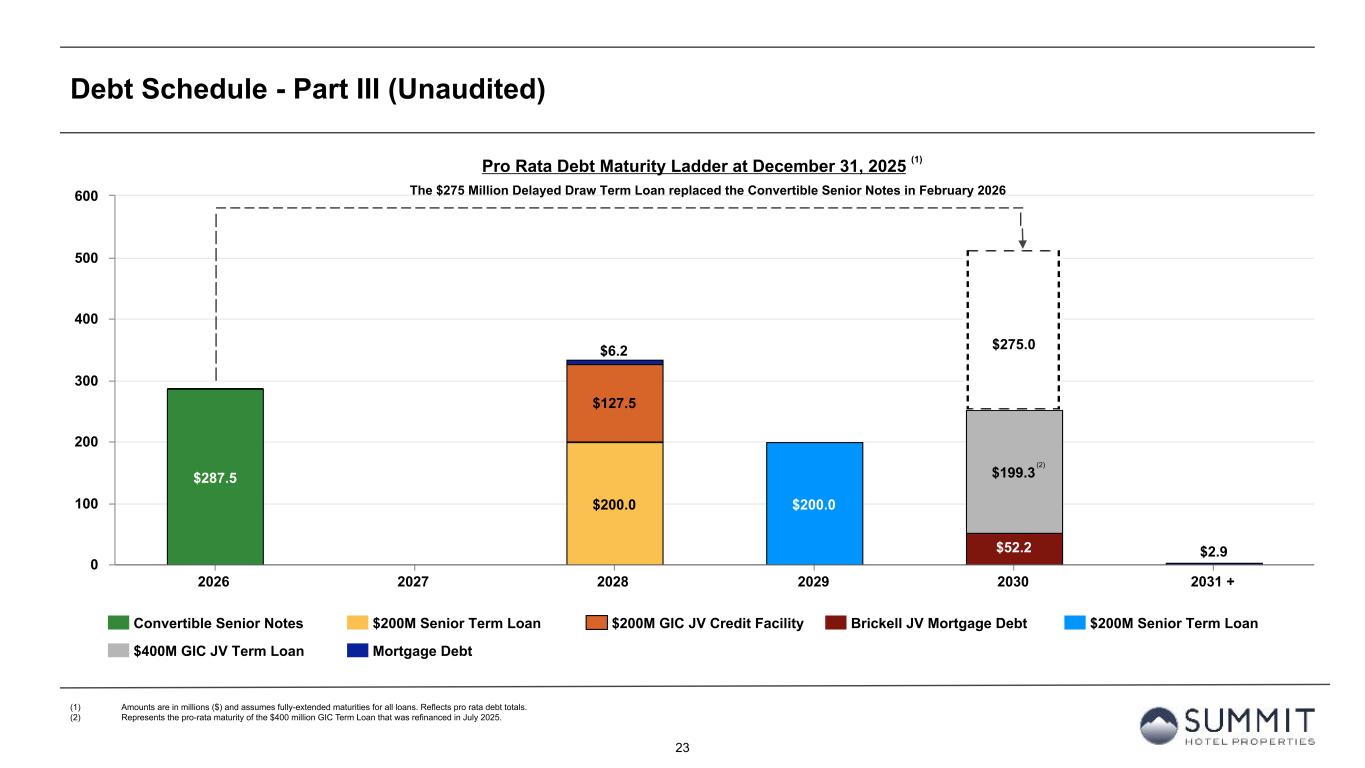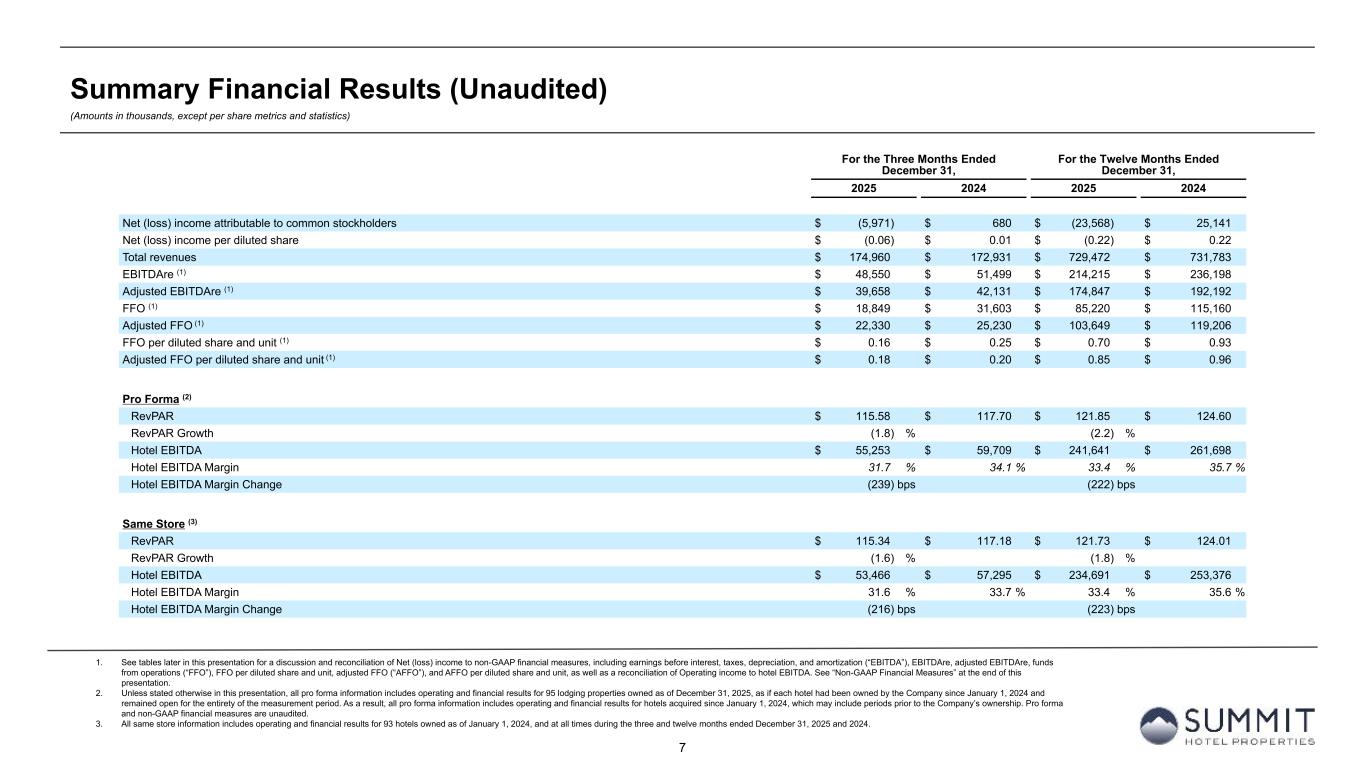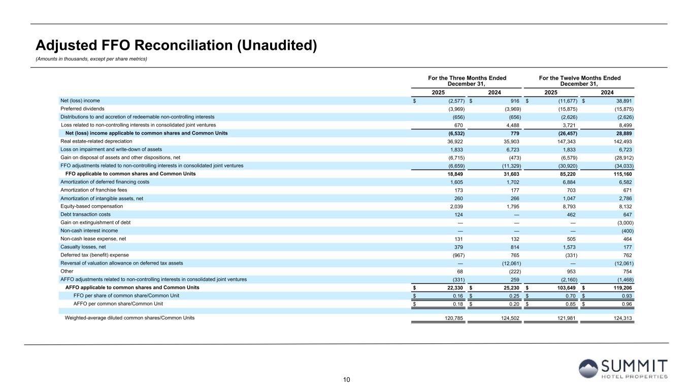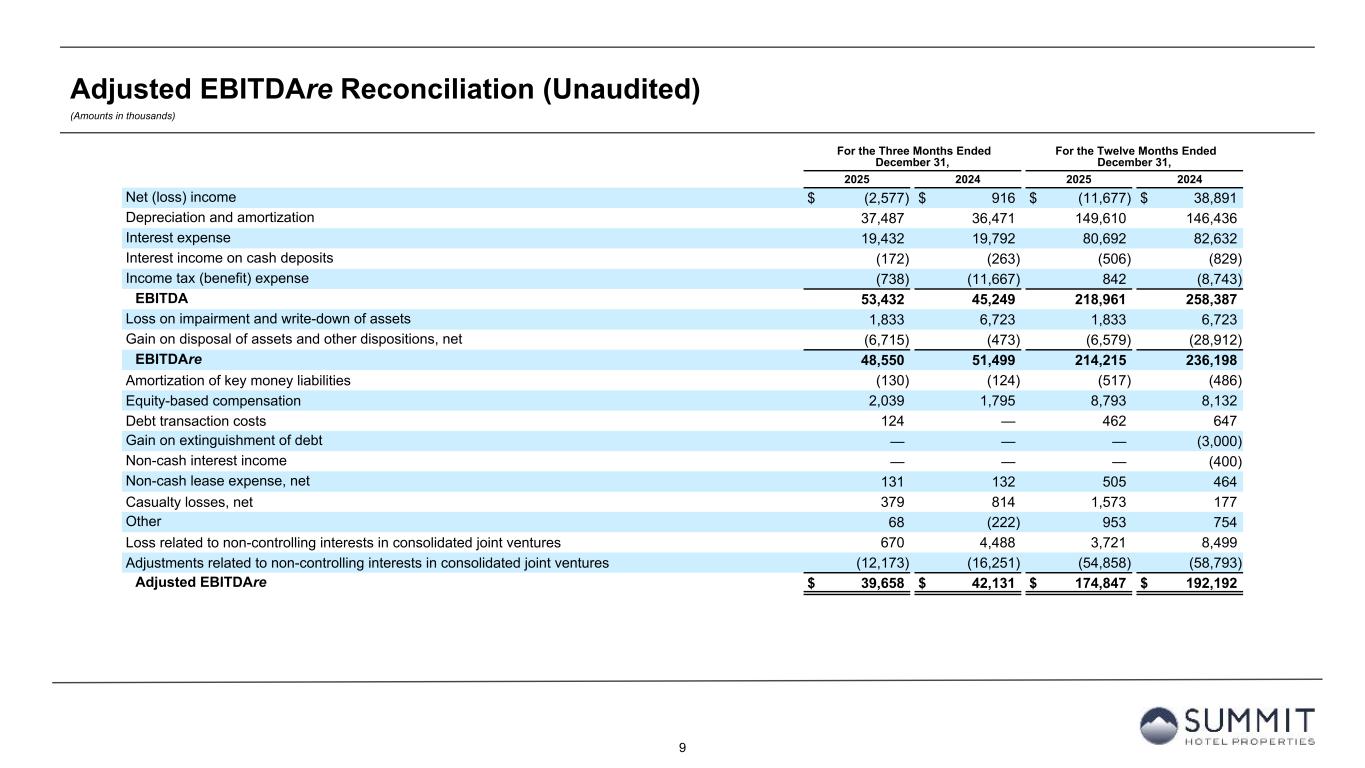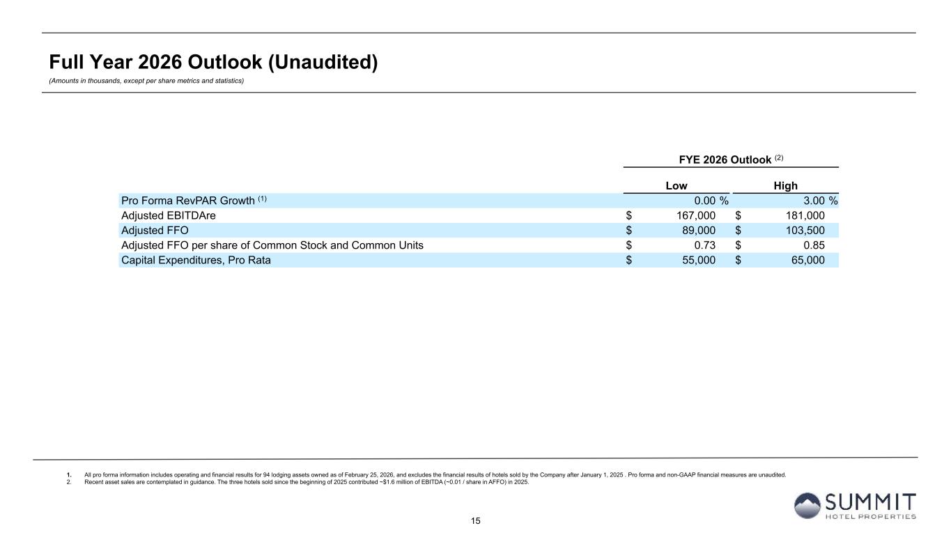 14 Reconciliation to Adjusted FFO - By Ownership Interest (Unaudited) (Amounts in thousands, except per share metrics) 1. GIC Joint Venture is 51% owned by Summit while Other Joint Ventures are 90% owned by Summit. 2. Non-cash interest income relates to the amortization of the discount on certain notes receivable. The discount on these notes receivable was recorded at inception of the related loans based on the estimated value of the embedded purchase options in the notes receivable. 3. The Company includes the outstanding OP units issued by Summit Hotel OP, LP, the Company’s operating partnership, held by limited partners other than the Company because the OP units are redeemable for cash or, at the Company’s option, shares of the Company’s common stock on a one-for-one basis. Summit GIC Other GIC JV Other JVs Wholly-Owned Joint Venture (1) Joint Ventures (1) Combined Pro Rata Adj Pro Rata Adj Pro Rata For The Twelve Months Ended December 31, 2025 2024 2025 2024 2025 2024 2025 2024 2025 2024 2025 2024 2025 2024 Net (loss) income $ (4,695) $ 54,513 $ (7,591) $ (16,548) $ 609 $ 926 $ (11,677) $ 38,891 $ 3,782 $ 8,592 $ (61) $ (93) $ (7,956) $ 47,390 Preferred dividends (15,875) (15,875) — — — — (15,875) (15,875) — — — — (15,875) (15,875) Distributions to and accretion of redeemable non-controlling interests (2,626) (2,626) — — — — (2,626) (2,626) — — — — (2,626) (2,626) Net (loss) income applicable to common shares and Common Units (23,196) 36,012 (7,591) (16,548) 609 926 (30,178) 20,390 3,782 8,592 (61) (93) (26,457) 28,889 Real estate-related depreciation 77,997 76,163 64,280 62,048 5,066 4,282 147,343 142,493 (31,497) (30,404) (507) (428) 115,339 111,661 Loss on impairment and write-down of assets — — 1,833 6,723 — — 1,833 6,723 (898) (3,294) — — 935 3,429 (Gain) loss on disposal of assets and other dispositions, net (2,534) (28,738) (4,045) (193) — 19 (6,579) (28,912) 1,982 95 — (2) (4,597) (28,819) FFO applicable to common shares and Common Units 52,267 83,437 54,477 52,030 5,675 5,227 112,419 140,694 (26,631) (25,011) (568) (523) 85,220 115,160 Amortization of deferred financing costs 4,296 4,651 2,364 1,871 224 60 6,884 6,582 (1,158) (917) (22) (6) 5,704 5,659 Amortization of franchise fees 364 354 339 317 — — 703 671 (166) (155) — — 537 516 Amortization of intangible assets (34) (3) 1,081 2,789 — — 1,047 2,786 (530) (1,367) — — 517 1,419 Equity based compensation 8,793 8,132 — — — — 8,793 8,132 — — — — 8,793 8,132 Debt transaction costs 122 627 326 20 14 — 462 647 (160) (10) (1) — 301 637 Gain on extinguishment of debt — (3,000) — — — — — (3,000) — — — — — (3,000) Non-Cash Interest Income (2) — (400) — — — — — (400) — — — — — (400) Non-cash lease expense, net 478 474 27 (10) — — 505 464 (13) 5 — — 492 469 Casualty losses (gains), net 1,197 1,280 347 (707) 29 (396) 1,573 177 (170) 346 (3) 40 1,400 563 Deferred tax (benefit) expense (173) 731 (158) 31 — — (331) 762 77 (15) — — (254) 747 Reversal of deferred tax valuation allowance — (10,347) — (1,714) — — — (12,061) — 840 — — — (11,221) Other 782 284 — 470 171 — 953 754 3 (229) (17) — 939 525 AFFO applicable to common shares and common units (3) $ 68,092 $ 86,220 $ 58,803 $ 55,097 $ 6,113 $ 4,891 $ 133,008 $ 146,208 $ (28,748) $ (26,513) $ (611) $ (489) $ 103,649 $ 119,206 FFO per common share/Common Unit $ 0.70 $ 0.93 AFFO per common share/Common Unit $ 0.85 $ 0.96 Weighted-average diluted common shares/Common Units (3) 121,981 124,313