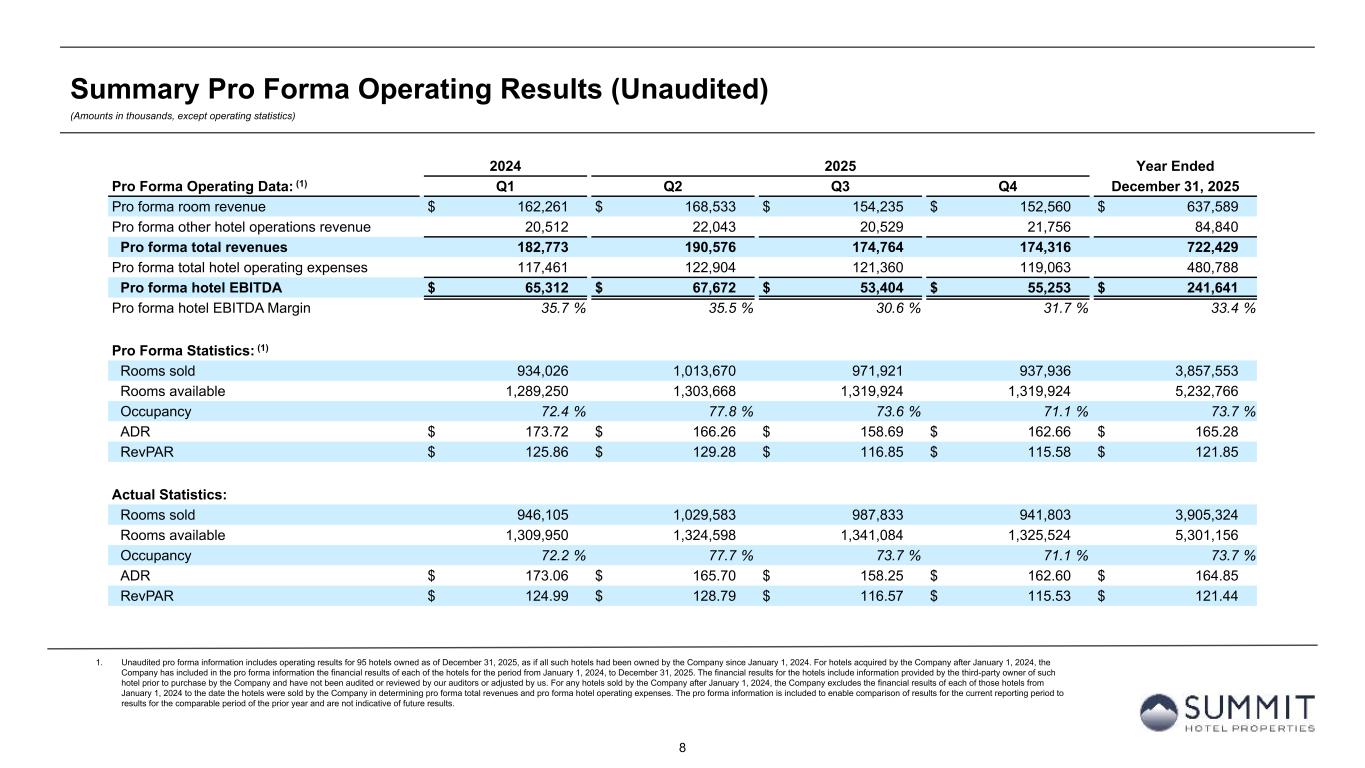 7 Summary Financial Results (Unaudited) (Amounts in thousands, except per share metrics and statistics) For the Three Months Ended December 31, For the Twelve Months Ended December 31, 2025 2024 2025 2024 Net (loss) income attributable to common stockholders $ (5,971) $ 680 $ (23,568) $ 25,141 Net (loss) income per diluted share $ (0.06) $ 0.01 $ (0.22) $ 0.22 Total revenues $ 174,960 $ 172,931 $ 729,472 $ 731,783 EBITDAre (1) $ 48,550 $ 51,499 $ 214,215 $ 236,198 Adjusted EBITDAre (1) $ 39,658 $ 42,131 $ 174,847 $ 192,192 FFO (1) $ 18,849 $ 31,603 $ 85,220 $ 115,160 Adjusted FFO (1) $ 22,330 $ 25,230 $ 103,649 $ 119,206 FFO per diluted share and unit (1) $ 0.16 $ 0.25 $ 0.70 $ 0.93 Adjusted FFO per diluted share and unit (1) $ 0.18 $ 0.20 $ 0.85 $ 0.96 Pro Forma (2) RevPAR $ 115.58 $ 117.70 $ 121.85 $ 124.60 RevPAR Growth (1.8) % (2.2) % Hotel EBITDA $ 55,253 $ 59,709 $ 241,641 $ 261,698 Hotel EBITDA Margin 31.7 % 34.1 % 33.4 % 35.7 % Hotel EBITDA Margin Change (239) bps (222) bps Same Store (3) RevPAR $ 115.34 $ 117.18 $ 121.73 $ 124.01 RevPAR Growth (1.6) % (1.8) % Hotel EBITDA $ 53,466 $ 57,295 $ 234,691 $ 253,376 Hotel EBITDA Margin 31.6 % 33.7 % 33.4 % 35.6 % Hotel EBITDA Margin Change (216) bps (223) bps 1. See tables later in this presentation for a discussion and reconciliation of Net (loss) income to non-GAAP financial measures, including earnings before interest, taxes, depreciation, and amortization (“EBITDA”), EBITDAre, adjusted EBITDAre, funds from operations (“FFO”), FFO per diluted share and unit, adjusted FFO (“AFFO”), and AFFO per diluted share and unit, as well as a reconciliation of Operating income to hotel EBITDA. See “Non-GAAP Financial Measures” at the end of this presentation. 2. Unless stated otherwise in this presentation, all pro forma information includes operating and financial results for 95 lodging properties owned as of December 31, 2025, as if each hotel had been owned by the Company since January 1, 2024 and remained open for the entirety of the measurement period. As a result, all pro forma information includes operating and financial results for hotels acquired since January 1, 2024, which may include periods prior to the Company’s ownership. Pro forma and non-GAAP financial measures are unaudited. 3. All same store information includes operating and financial results for 93 hotels owned as of January 1, 2024, and at all times during the three and twelve months ended December 31, 2025 and 2024.