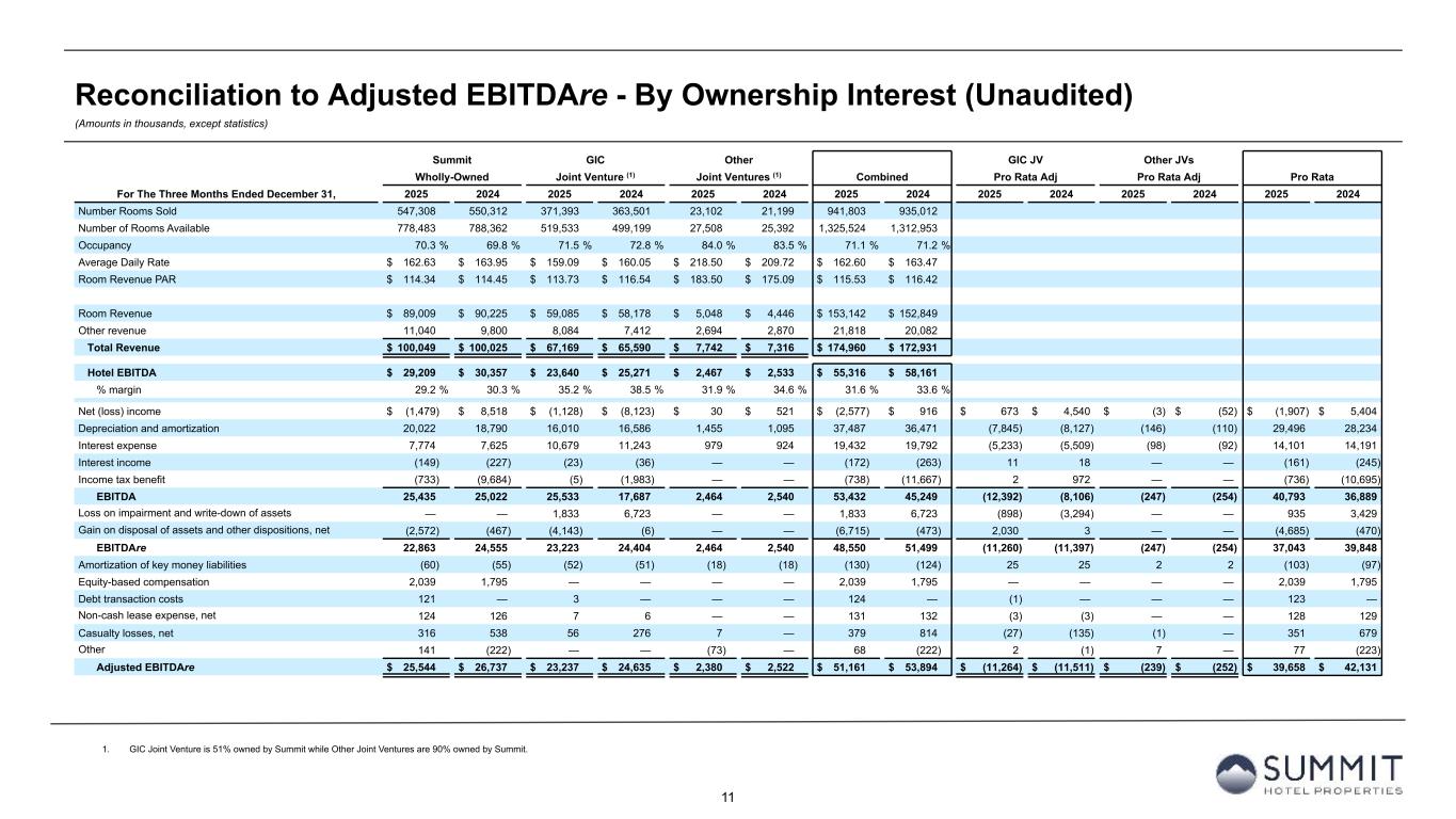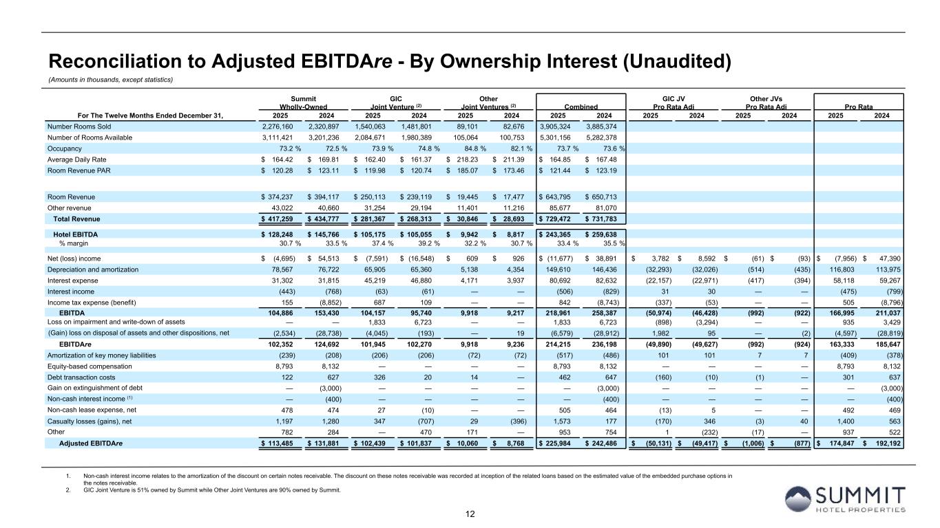11 Reconciliation to Adjusted EBITDAre - By Ownership Interest (Unaudited) (Amounts in thousands, except statistics) 1. GIC Joint Venture is 51% owned by Summit while Other Joint Ventures are 90% owned by Summit. Summit GIC Other GIC JV Other JVs Wholly-Owned Joint Venture (1) Joint Ventures (1) Combined Pro Rata Adj Pro Rata Adj Pro Rata For The Three Months Ended December 31, 2025 2024 2025 2024 2025 2024 2025 2024 2025 2024 2025 2024 2025 2024 Number Rooms Sold 547,308 550,312 371,393 363,501 23,102 21,199 941,803 935,012 Number of Rooms Available 778,483 788,362 519,533 499,199 27,508 25,392 1,325,524 1,312,953 Occupancy 70.3 % 69.8 % 71.5 % 72.8 % 84.0 % 83.5 % 71.1 % 71.2 % Average Daily Rate $ 162.63 $ 163.95 $ 159.09 $ 160.05 $ 218.50 $ 209.72 $ 162.60 $ 163.47 Room Revenue PAR $ 114.34 $ 114.45 $ 113.73 $ 116.54 $ 183.50 $ 175.09 $ 115.53 $ 116.42 Room Revenue $ 89,009 $ 90,225 $ 59,085 $ 58,178 $ 5,048 $ 4,446 $ 153,142 $ 152,849 Other revenue 11,040 9,800 8,084 7,412 2,694 2,870 21,818 20,082 Total Revenue $ 100,049 $ 100,025 $ 67,169 $ 65,590 $ 7,742 $ 7,316 $ 174,960 $ 172,931 Hotel EBITDA $ 29,209 $ 30,357 $ 23,640 $ 25,271 $ 2,467 $ 2,533 $ 55,316 $ 58,161 % margin 29.2 % 30.3 % 35.2 % 38.5 % 31.9 % 34.6 % 31.6 % 33.6 % Net (loss) income $ (1,479) $ 8,518 $ (1,128) $ (8,123) $ 30 $ 521 $ (2,577) $ 916 $ 673 $ 4,540 $ (3) $ (52) $ (1,907) $ 5,404 Depreciation and amortization 20,022 18,790 16,010 16,586 1,455 1,095 37,487 36,471 (7,845) (8,127) (146) (110) 29,496 28,234 Interest expense 7,774 7,625 10,679 11,243 979 924 19,432 19,792 (5,233) (5,509) (98) (92) 14,101 14,191 Interest income (149) (227) (23) (36) — — (172) (263) 11 18 — — (161) (245) Income tax benefit (733) (9,684) (5) (1,983) — — (738) (11,667) 2 972 — — (736) (10,695) EBITDA 25,435 25,022 25,533 17,687 2,464 2,540 53,432 45,249 (12,392) (8,106) (247) (254) 40,793 36,889 Loss on impairment and write-down of assets — — 1,833 6,723 — — 1,833 6,723 (898) (3,294) — — 935 3,429 Gain on disposal of assets and other dispositions, net (2,572) (467) (4,143) (6) — — (6,715) (473) 2,030 3 — — (4,685) (470) EBITDAre 22,863 24,555 23,223 24,404 2,464 2,540 48,550 51,499 (11,260) (11,397) (247) (254) 37,043 39,848 Amortization of key money liabilities (60) (55) (52) (51) (18) (18) (130) (124) 25 25 2 2 (103) (97) Equity-based compensation 2,039 1,795 — — — — 2,039 1,795 — — — — 2,039 1,795 Debt transaction costs 121 — 3 — — — 124 — (1) — — — 123 — Non-cash lease expense, net 124 126 7 6 — — 131 132 (3) (3) — — 128 129 Casualty losses, net 316 538 56 276 7 — 379 814 (27) (135) (1) — 351 679 Other 141 (222) — — (73) — 68 (222) 2 (1) 7 — 77 (223) Adjusted EBITDAre $ 25,544 $ 26,737 $ 23,237 $ 24,635 $ 2,380 $ 2,522 $ 51,161 $ 53,894 $ (11,264) $ (11,511) $ (239) $ (252) $ 39,658 $ 42,131