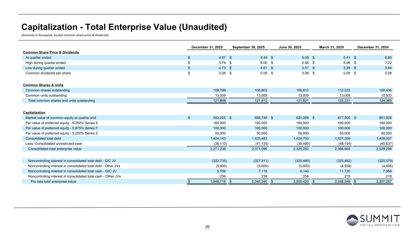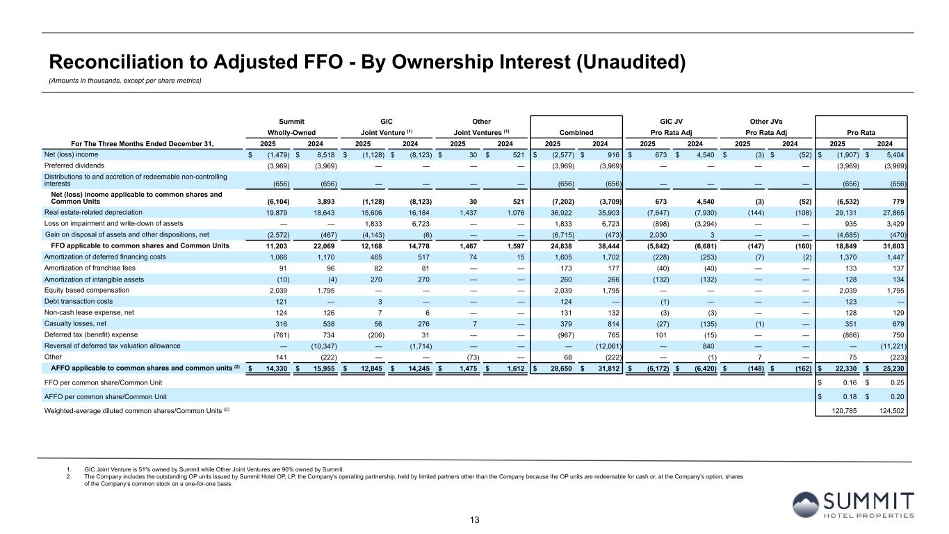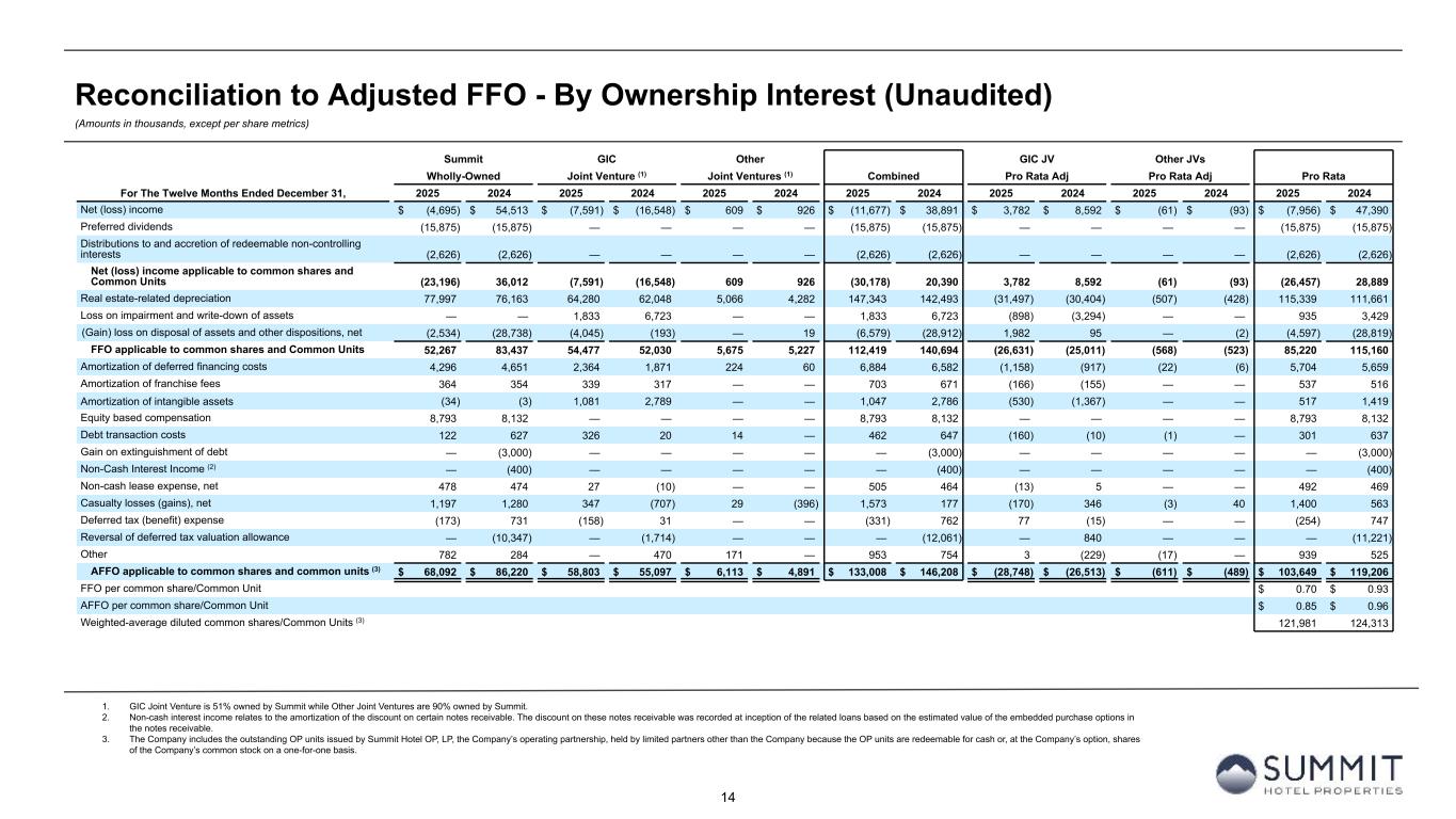 13 Reconciliation to Adjusted FFO - By Ownership Interest (Unaudited) (Amounts in thousands, except per share metrics) 1. GIC Joint Venture is 51% owned by Summit while Other Joint Ventures are 90% owned by Summit. 2. The Company includes the outstanding OP units issued by Summit Hotel OP, LP, the Company’s operating partnership, held by limited partners other than the Company because the OP units are redeemable for cash or, at the Company’s option, shares of the Company’s common stock on a one-for-one basis. Summit GIC Other GIC JV Other JVs Wholly-Owned Joint Venture (1) Joint Ventures (1) Combined Pro Rata Adj Pro Rata Adj Pro Rata For The Three Months Ended December 31, 2025 2024 2025 2024 2025 2024 2025 2024 2025 2024 2025 2024 2025 2024 Net (loss) income $ (1,479) $ 8,518 $ (1,128) $ (8,123) $ 30 $ 521 $ (2,577) $ 916 $ 673 $ 4,540 $ (3) $ (52) $ (1,907) $ 5,404 Preferred dividends (3,969) (3,969) — — — — (3,969) (3,969) — — — — (3,969) (3,969) Distributions to and accretion of redeemable non-controlling interests (656) (656) — — — — (656) (656) — — — — (656) (656) Net (loss) income applicable to common shares and Common Units (6,104) 3,893 (1,128) (8,123) 30 521 (7,202) (3,709) 673 4,540 (3) (52) (6,532) 779 Real estate-related depreciation 19,879 18,643 15,606 16,184 1,437 1,076 36,922 35,903 (7,647) (7,930) (144) (108) 29,131 27,865 Loss on impairment and write-down of assets — — 1,833 6,723 — — 1,833 6,723 (898) (3,294) — — 935 3,429 Gain on disposal of assets and other dispositions, net (2,572) (467) (4,143) (6) — — (6,715) (473) 2,030 3 — — (4,685) (470) FFO applicable to common shares and Common Units 11,203 22,069 12,168 14,778 1,467 1,597 24,838 38,444 (5,842) (6,681) (147) (160) 18,849 31,603 Amortization of deferred financing costs 1,066 1,170 465 517 74 15 1,605 1,702 (228) (253) (7) (2) 1,370 1,447 Amortization of franchise fees 91 96 82 81 — — 173 177 (40) (40) — — 133 137 Amortization of intangible assets (10) (4) 270 270 — — 260 266 (132) (132) — — 128 134 Equity based compensation 2,039 1,795 — — — — 2,039 1,795 — — — — 2,039 1,795 Debt transaction costs 121 — 3 — — — 124 — (1) — — — 123 — Non-cash lease expense, net 124 126 7 6 — — 131 132 (3) (3) — — 128 129 Casualty losses, net 316 538 56 276 7 — 379 814 (27) (135) (1) — 351 679 Deferred tax (benefit) expense (761) 734 (206) 31 — — (967) 765 101 (15) — — (866) 750 Reversal of deferred tax valuation allowance — (10,347) — (1,714) — — — (12,061) — 840 — — — (11,221) Other 141 (222) — — (73) — 68 (222) — (1) 7 — 75 (223) AFFO applicable to common shares and common units (2) $ 14,330 $ 15,955 $ 12,845 $ 14,245 $ 1,475 $ 1,612 $ 28,650 $ 31,812 $ (6,172) $ (6,420) $ (148) $ (162) $ 22,330 $ 25,230 FFO per common share/Common Unit $ 0.16 $ 0.25 AFFO per common share/Common Unit $ 0.18 $ 0.20 Weighted-average diluted common shares/Common Units (2) 120,785 124,502