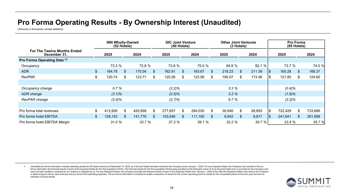 17 Pro Forma Operating Results - By Ownership Interest (Unaudited) (Amounts in thousands, except statistics) 1. Unaudited pro forma information includes operating results for 95 hotels owned as of December 31, 2025, as if all such hotels had been owned by the Company since January 1, 2024. For any hotels acquired by the Company after January 1, 2024 (the “Acquired Hotels”), the Company has included in the pro forma information the financial results of each of the Acquired Hotels for the period from January 1, 2024, to the date the Acquired Hotels were purchased by the Company (the “Pre-acquisition Period”). The financial results for the Pre-acquisition Period were provided by the third-party owner of such Acquired Hotel prior to purchase by the Company and have not been audited or reviewed by our auditors or adjusted by us. For any hotels sold by the Company after January 1, 2024 (the “Disposed Hotels”), the Company excludes the financial results of each of the Disposed Hotels from January 1, 2024 to the date the Disposed Hotels were sold by the Company in determining pro forma total revenues and pro forma hotel operating expenses. The pro forma information is included to enable comparison of results for the current reporting period to results for the comparable period of the prior year and are not indicative of future results. INN Wholly-Owned (52 Hotels) GIC Joint Venture (40 Hotels) Other Joint Ventures (3 Hotels) Pro Forma (95 Hotels) For The Three Months Ended December 31, 2025 2024 2025 2024 2025 2024 2025 2024 Pro Forma Operating Data (1) Occupancy 70.3 % 69.9 % 71.5 % 73.6 % 84.0 % 83.5 % 71.1 % 71.6 % ADR $ 162.66 $ 164.43 $ 159.16 $ 161.94 $ 218.50 $ 209.72 $ 162.66 $ 164.44 RevPAR $ 114.37 $ 114.86 $ 113.79 $ 119.12 $ 183.50 $ 175.09 $ 115.58 $ 117.70 Occupancy change 0.7 % (2.8) % 0.6 % (0.7) % ADR change (1.1) % (1.7) % 4.2 % (1.1) % RevPAR change (0.4) % (4.5) % 4.8 % (1.8) % Pro forma total revenues $ 99,643 $ 98,673 $ 66,931 $ 69,157 $ 7,742 $ 7,316 $ 174,316 $ 175,146 Pro forma hotel EBITDA $ 29,225 $ 30,066 $ 23,561 $ 27,110 $ 2,467 $ 2,533 $ 55,253 $ 59,709 Pro forma hotel EBITDA Margin 29.3 % 30.5 % 35.2 % 39.2 % 31.9 % 34.6 % 31.7 % 34.1 %