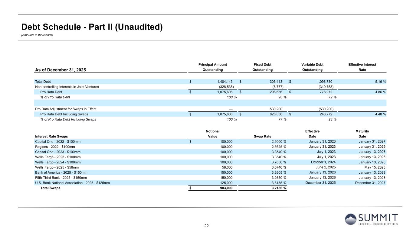 21 Number of Pro Rata Base Interest Fixed/ Fully-Extended Encumbered Principal Non-controlling Principal As of December 31, 2025 Spread Rate Rate Variable Maturity Date Properties Outstanding Interests Outstanding Senior Credit Facility $400 Million Revolver 2.15% 3.69% 5.84% Variable 06/21/2028 n/a $ — $ — $ — $200 Million Term Loan 2.10% 3.92% 6.02% Variable 06/21/2028 n/a 200,000 — 200,000 Total Senior Credit and Term Loan Facility 200,000 — 200,000 Convertible Notes n/a n/a 1.50% Fixed 02/15/2026 n/a 287,500 — 287,500 Term Loans Regions Bank 2024 Term Loan Facility 2.10% 3.82% 5.92% Variable 02/26/2029 n/a 200,000 — 200,000 $275 Million 2025 Delayed Draw Term Loan 2.10% 3.69% 5.79% Variable 03/27/2030 n/a — — — 200,000 — 200,000 687,500 — 687,500 Brickell Joint Venture Mortgage Loan Wells Fargo Bank, N.A. 2.60% 3.87% 6.47% Variable 05/15/2030 2 58,000 (5,800) 52,200 GIC Joint Venture Credit Facility and Term Loans $125 Million Revolver 2.15% 3.92% 6.07% Variable 09/15/2028 n/a 125,000 (61,250) 63,750 $125 Million Term Loan 2.10% 3.92% 6.02% Variable 09/15/2028 n/a 125,000 (61,250) 63,750 Bank of America, N.A. 2025 Term Loan 2.35% 3.92% 6.27% Variable 07/24/2030 n/a 390,730 (191,458) 199,272 Wells Fargo n/a n/a 4.99% Fixed 06/06/2028 1 12,253 (6,004) 6,249 PACE Loan n/a n/a 6.10% Fixed 07/31/2040 n/a 5,660 (2,773) 2,887 Total GIC Joint Venture Credit Facility and Term Loans 1 658,643 (322,735) 335,908 Total Joint Venture Debt 3 716,643 (328,535) 388,108 Total Debt 3 $ 1,404,143 $ (328,535) $ 1,075,608 Debt Schedule - Part I (Unaudited) (Amounts in thousands except for number of properties)