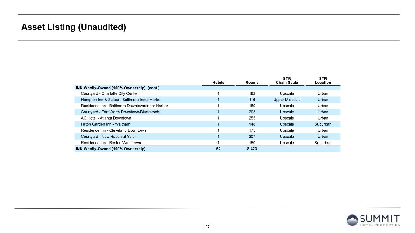 26 Asset Listing (Unaudited) Hotels Rooms STR Chain Scale STR Location INN Wholly-Owned (100% Ownership), (cont.) SpringHill Suites - Louisville Downtown 1 198 Upscale Urban SpringHill Suites - Indianapolis Downtown 1 156 Upscale Urban Courtyard - Indianapolis Downtown 1 297 Upscale Urban Hampton Inn & Suites - San Diego/Poway 1 108 Upper Midscale Suburban Hampton Inn & Suites - Camarillo 1 116 Upper Midscale Suburban Hilton Garden Inn - Houston/Galleria Area 1 182 Upscale Urban Doubletree by Hilton San Francisco Airport North Bayfront 1 210 Upscale Airport Hilton Garden Inn - Houston/Energy Corridor 1 190 Upscale Suburban Hampton Inn & Suites - Austin/Downtown/Convention Center 1 209 Upper Midscale Urban Hampton Inn & Suites - Minneapolis/Downtown 1 211 Upper Midscale Urban Residence Inn - Bridgewater/Branchburg 1 101 Upscale Suburban Hyatt House - Across From Universal Orlando Resort 1 168 Upscale Resort Residence Inn - Baltimore/Hunt Valley 1 141 Upscale Suburban Hotel Indigo - Asheville Downtown 1 116 Upper Upscale Urban Courtyard - Atlanta Decatur Downtown/Emory 1 179 Upscale Suburban Courtyard - Nashville Vanderbilt/West End 1 226 Upscale Urban Residence Inn - Atlanta Midtown/Peachtree at 17th 1 160 Upscale Urban Hyatt House - Miami Airport 1 163 Upscale Airport Marriott - Boulder 1 165 Upper Upscale Urban Hyatt Place - Chicago/Downtown-The Loop 1 206 Upscale Urban Hyatt Place - Phoenix/Mesa 1 152 Upscale Suburban Courtyard - Fort Lauderdale Beach 1 261 Upscale Resort