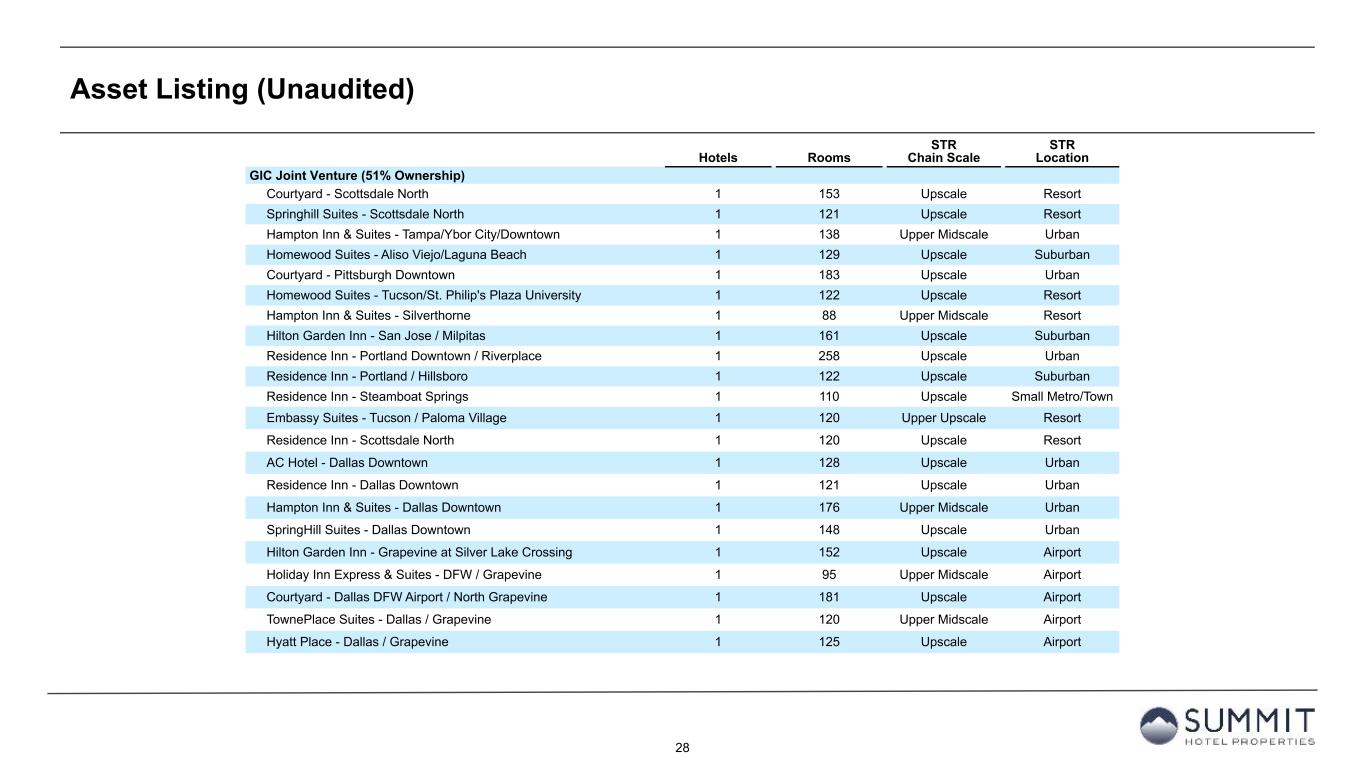 27 Asset Listing (Unaudited) Hotels Rooms STR Chain Scale STR Location INN Wholly-Owned (100% Ownership), (cont.) Courtyard - Charlotte City Center 1 182 Upscale Urban Hampton Inn & Suites - Baltimore Inner Harbor 1 116 Upper Midscale Urban Residence Inn - Baltimore Downtown/Inner Harbor 1 189 Upscale Urban Courtyard - Fort Worth Downtown/Blackstone 1 203 Upscale Urban AC Hotel - Atlanta Downtown 1 255 Upscale Urban Hilton Garden Inn - Waltham 1 148 Upscale Suburban Residence Inn - Cleveland Downtown 1 175 Upscale Urban Courtyard - New Haven at Yale 1 207 Upscale Urban Residence Inn - Boston/Watertown 1 150 Upscale Suburban INN Wholly-Owned (100% Ownership) 52 8,423 (2)