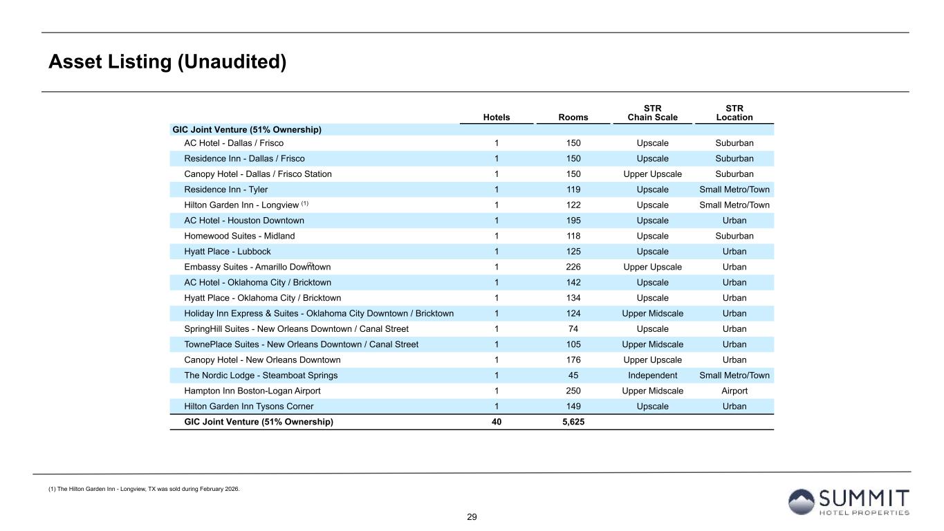 29 Asset Listing (Unaudited) (1) The Hilton Garden Inn - Longview, TX was sold during February 2026. Hotels Rooms STR Chain Scale STR Location GIC Joint Venture (51% Ownership) AC Hotel - Dallas / Frisco 1 150 Upscale Suburban Residence Inn - Dallas / Frisco 1 150 Upscale Suburban Canopy Hotel - Dallas / Frisco Station 1 150 Upper Upscale Suburban Residence Inn - Tyler 1 119 Upscale Small Metro/Town Hilton Garden Inn - Longview (1) 1 122 Upscale Small Metro/Town AC Hotel - Houston Downtown 1 195 Upscale Urban Homewood Suites - Midland 1 118 Upscale Suburban Hyatt Place - Lubbock 1 125 Upscale Urban Embassy Suites - Amarillo Downtown 1 226 Upper Upscale Urban AC Hotel - Oklahoma City / Bricktown 1 142 Upscale Urban Hyatt Place - Oklahoma City / Bricktown 1 134 Upscale Urban Holiday Inn Express & Suites - Oklahoma City Downtown / Bricktown 1 124 Upper Midscale Urban SpringHill Suites - New Orleans Downtown / Canal Street 1 74 Upscale Urban TownePlace Suites - New Orleans Downtown / Canal Street 1 105 Upper Midscale Urban Canopy Hotel - New Orleans Downtown 1 176 Upper Upscale Urban The Nordic Lodge - Steamboat Springs 1 45 Independent Small Metro/Town Hampton Inn Boston-Logan Airport 1 250 Upper Midscale Airport Hilton Garden Inn Tysons Corner 1 149 Upscale Urban GIC Joint Venture (51% Ownership) 40 5,625 (2)