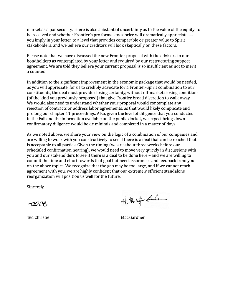 market as a par security. There is also substantial uncertainty as to the value of the equity to be received and whether Frontier’s pro forma stock price will dramatically appreciate, as you imply in your letter, to a level that provides comparable or greater value to Spirit stakeholders, and we believe our creditors will look skeptically on these factors. Please note that we have discussed the new Frontier proposal with the advisors to our bondholders as contemplated by your letter and required by our restructuring support agreement. We are told they believe your current proposal is so insufficient as not to merit a counter. In addition to the significant improvement in the economic package that would be needed, as you will appreciate, for us to credibly advocate for a Frontier - Spirit combination to our constituents, the deal must provide closing certainty, without off - market closing conditions (of the kind you previously proposed) that give Frontier broad discretion to walk away. We would also need to understand whether your proposal would contemplate any rejection of contracts or address labor agreements, as that would likely complicate and prolong our chapter 11 proceedings. Also, given the level of diligence that you conducted in the Fall and the information available on the public docket, we expect bring - down confirmatory diligence would be de minimis and completed in a matter of days. As we noted above, we share your view on the logic of a combination of our companies and are willing to work with you constructively to see if there is a deal that can be reached that is acceptable to all parties. Given the timing (we are about three weeks before our scheduled confirmation hearing), we would need to move very quickly in discussions with you and our stakeholders to see if there is a deal to be done here – and we are willing to commit the time and effort towards that goal but need assurances and feedback from you on the above topics. We recognize that the gap may be too large, and if we cannot reach agreement with you, we are highly confident that our extremely efficient standalone reorganization will position us well for the future. Sincerely, Ted Christie Mac Gardner