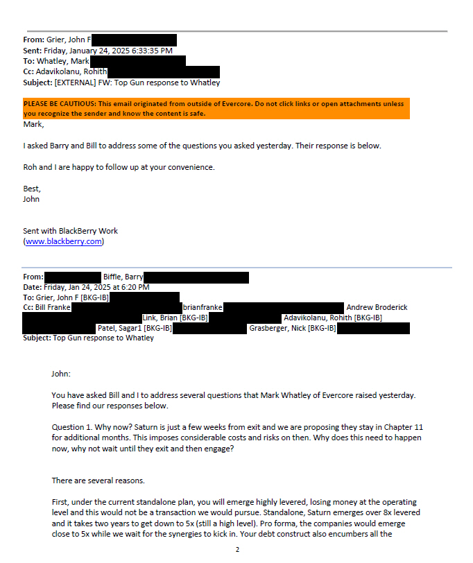 From: Grier, John F Sent: Friday, January 24, 2025 6:33:35 PM To: Whatley, Mark Cc: Adavikolanu, Rohith Subject: [EXTERNAL] FW: Top Gun response to Whatley PLEASE BE CAUTIOUS: This email originated from outside of Evercore. Do not click links or open attachments unless you recognize the sender and know the content is safe. Mark, I asked Barry and Bill to address some of the questions you asked yesterday. Their response is below. Roh and I are happy to follow up at your convenience. Best, John Sent with BlackBerry Work ( www.blackberry.com ) From: Biffle, Barry Date: Friday, Jan 24, 2025 at 6:20 ථ PM To: Grier, John F [BKG - IB] Cc: Bill Franke brianfranke Andrew Broderick Link, Brian [BKG - IB] Adavikolanu, Rohith [BKG - IB] Patel, Sagar1 [BKG - IB] Grasberger, Nick [BKG - IB] Subject: Top Gun response to Whatley John: You have asked Bill and I to address several questions that Mark Whatley of Evercore raised yesterday. Please find our responses below. Question 1 . Why now? Saturn is just a few weeks from exit and we are proposing they stay in Chapter 11 for additional months . This imposes considerable costs and risks on then . Why does this need to happen now, why not wait until they exit and then engage? There are several reasons. First, under the current standalone plan, you will emerge highly levered, losing money at the operating level and this would not be a transaction we would pursue. Standalone, Saturn emerges over 8x levered and it takes two years to get down to 5x (still a high level). Pro forma, the companies would emerge close to 5x while we wait for the synergies to kick in. Your debt construct also encumbers all the 2