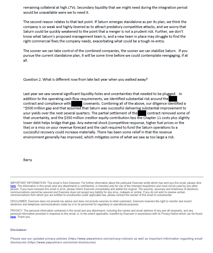 remaining collateral at high LTVs. Secondary liquidity that we might need during the integration period would be unavailable were we to need it. The second reason relates to that last point. If Saturn emerges standalone as per its plan, we think the company is so weak and highly levered as to attract predatory competitive attacks, and we worry that Saturn could be quickly weakened to the point that a merger is not a prudent risk. Further, we don’t know what Saturn’s proposed management team is, and a new team in place may struggle to find the right commercial fixes the company needs, exacerbating what could be a tough re - entry. The sooner we can take control of the combined companies, the sooner we can stabilize Saturn . If you pursue the current standalone plan, it will be some time before we could contemplate reengaging, if at all . Question 2. What is different now from late last year when you walked away? Last year we saw several significant liquidity holes and uncertainties that needed to be plugged. In addition to the operating cash flow requirements, we identified substantial risk around the contract and compliance with covenants. Combining all of the above, our diligence identified a ~$500 million gap and that assumed that Saturn was successful delivering substantial improvement to your yields over the next several quarters. The partial settlement of the contract removed some of that uncertainty, and the $350 million creditor equity contribution less the Chapter 11 costs plus slightly lower debt helps bridge that gap. Any external shock (competitive response, higher fuel prices or the like) or a miss on your revenue forecast and the cash required to fund the Saturn operations to a successful recovery could increase materially. There has been some relief in that the revenue environment generally has improved, which mitigates some of what we saw as too large a risk. Barry IMPORTANT INFORMATION: This email is from Evercore. For further information about the particular Evercore entity which has sent you this email, please click here . The information in this email (and any attachment) is confidential, is intended only for use of the intended recipient(s) and must not be used by any other person. If you have received this email in error, please inform Evercore immediately and delete the original. The security, accuracy and ti meliness of electronic communications cannot be assured and Evercore does not accept any liability for any virus, malware or similar. If you do not wish to receive certain communications from which you are entitled to unsubscribe under applicable law, please contact the sender of this email to unsubscribe. DISCLAIMER: Evercore does not provide tax advice and does not provide services to retail customers. Evercore reserves the right to monitor and record electronic and telephone communications made by or to its personnel for regulatory or operational purposes. PRIVACY: The personal information contained in this email and any attachment, including the names and email address of any and all recipients, and any personal information provided in response to this email, is, to the extent applicable, handled by Evercore in accordance with its Privacy Notice which can be found here . Thank you. Disclaimer Please see our updated privacy policies (http s://www.pwpartners.com/privacy - notic es) as well as important information regarding email disclosures (htt ps://www.pwp art ners.com/email - d i sclosures) 3