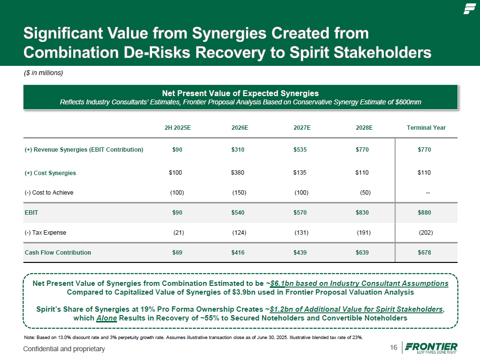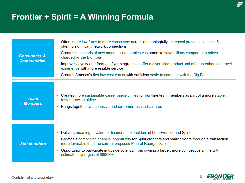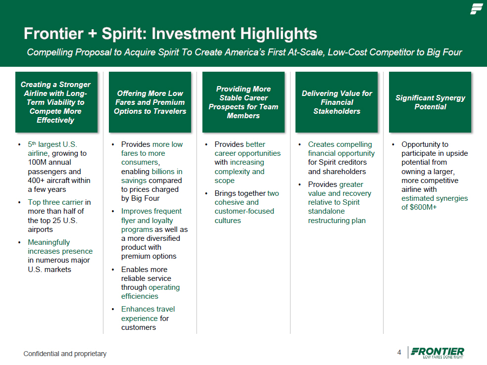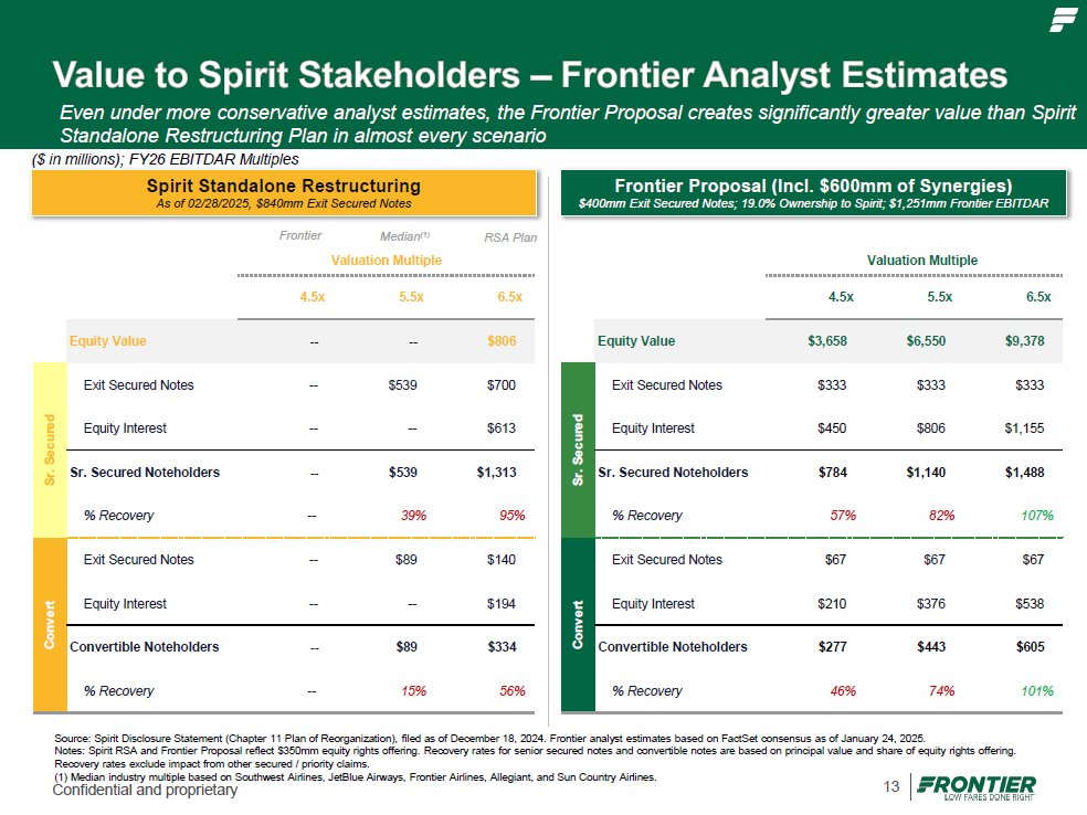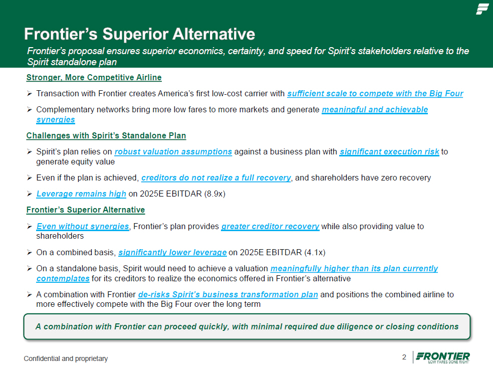 2 Confidential and proprietary Frontier’s proposal ensures superior economics, certainty, and speed for Spirit’s stakeholders relative to the Spirit standalone plan Stronger, More Competitive Airline » Transaction with Frontier creates America’s first low - cost carrier with sufficient scale to compete with the Big Four » Complementary networks bring more low fares to more markets and generate meaningful and achievable synergies Challenges with Spirit’s Standalone Plan » Spirit’s plan relies on robust valuation assumptions against a business plan with significant execution risk to generate equity value » Even if the plan is achieved, creditors do not realize a full recovery , and shareholders have zero recovery » Leverage remains high on 2025E EBITDAR (8.9x) Frontier’s Superior Alternative » Even without synergies , Frontier’s plan provides greater creditor recovery while also providing value to shareholders » On a combined basis, significantly lower leverage on 2025E EBITDAR (4.1x) » On a standalone basis, Spirit would need to achieve a valuation meaningfully higher than its plan currently contemplates for its creditors to realize the economics offered in Frontier’s alternative » A combination with Frontier de - risks Spirit’s business transformation plan and positions the combined airline to more effectively compete with the Big Four over the long term A combination with Frontier can proceed quickly, with minimal required due diligence or closing conditions