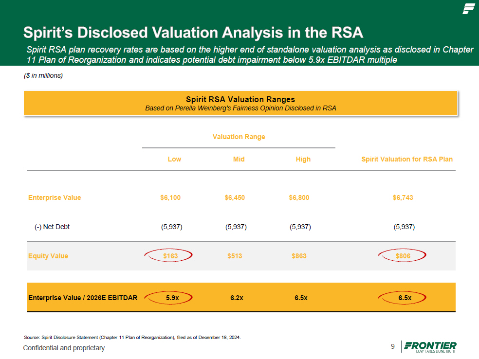 8 Confidential and proprietary Source: Spirit Disclosure Statement (Chapter 11 Plan of Reorganization), filed as of December 18, 2024. Notes: Spirit RSA and Frontier Proposal reflect $350mm equity rights offering. Recovery rates for senior secured notes and convertible notes are based on principal value and share of equity rights offering. Recovery rates exclude impact from other secured / priority claims. (1) Figures include $600mm of run - rate synergies. (2) Net leverage reflects net debt as of 02/28/2025 divided by 2025E Pro forma EBITDAR incl. 50% credit for synergies. (3) Reflects Spirit equity ownership split of 76% senior secured noteholders, 24% convertible notes. (4) Illustrative equity ownership split of 65% senior secured noteholders, 30% convertible notes, 5% common stock. (5) Per share figures based on Spirit basic shares outstanding as of November 14, 2024; rounded to the nearest $0.05. ($ in millions) Spirit Standalone Restructuring Frontier Proposal Creditor Consideration $400 $840 Exit Secured Notes 11.0% Cash / 8.0% Cash + 4.0% PIK (specifics to be discussed) 11.0% Cash / 8.0% Cash + 4.0% PIK Coupon 19.0% of PF Frontier + Spirit 100% of Spirit % Ownership Frontier + Spirit Spirit Pro Forma Entity $11,059 $5,411 Revenue (FY26) $3,476 (1) $1,041 EBITDAR (FY26) $9,356 $5,937 Net Debt (2/28/2025) 4.1x 8.9x Net Leverage (2) $600 -- Run - Rate Synergies es the same valuation $13,161 irit’s standalone plan $806 Frontier’s proposal us assumptions as Sp Equity Value (@ 6.5x EBITDAR FY26 per RSA Plan) $2,901 $1,646 Total Value to Stakeholders Recovery % (4) (Incl. Synergies) Recovery % (4) (Excl. Synergies) Recovery % (3) Recovery 141% 106% 95% Senior Secured Notes 137% 100% 56% Convertible Notes $1.15 / share $0.80 / share $0.00 / share Common Stock (5)