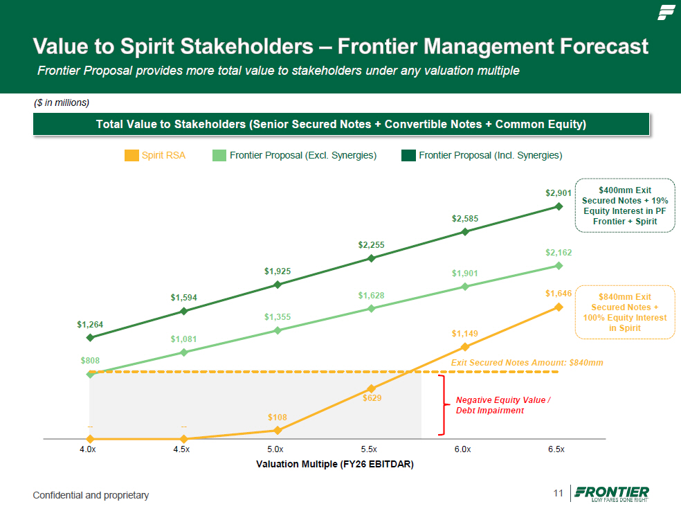 10 Confidential and proprietary Spirit Standalone Restructuring As of 02/28/2025, $840mm Exit Secured Notes Frontier Proposal (Excluding Synergies) $400mm Exit Secured Notes; 19.0% Ownership to Spirit; $1,835mm Frontier EBITDAR Frontier Proposal (Incl. $600mm of Synergies) $400mm Exit Secured Notes; 19.0% Ownership to Spirit; $1,835mm Frontier EBITDAR At the same valuation multiples as Spirit RSA analysis; Frontier Proposal creates significantly greater value than Spirit Standalone Restructuring Plan ($ in millions); FY26 EBITDAR Multiples Source: Spirit Disclosure Statement (Chapter 11 Plan of Reorganization), filed as of December 18, 2024. Notes: Spirit RSA and Frontier Proposal reflect $350mm equity rights offering. Recovery rates for senior secured notes and convertible notes are based on principal value and share of equity rights offering. Recovery rates exclude impact from other secured / priority claims. (1) Median industry multiple based on Southwest Airlines, JetBlue Airways, Frontier Airlines, Allegiant, and Sun Country Airlines. 4.1x Spirit Standalone Frontier + Spirit Net Leverage Net Debt as of 02/28/2025 divided by FY25 EBITDAR 8.9x Equity Value Exit Secured Notes -- $539 $700 Equity Interest -- -- $613 Sr. Secured Sr. Secured Noteholders -- $539 $1,313 % Recovery -- 39% 95% Exit Secured Notes -- $89 $140 Equity Interest -- -- $194 Convert Convertible Noteholders -- $89 $334 % Recovery -- 15% 56% Equity Value Valuation Multiple 4.5x 5.5x 6.5x $3,586 $6,462 $9,274 Exit Secured Notes $333 $333 $333 Equity Interest $442 $796 $1,142 Sr. Secured Sr. Secured Noteholders $775 $1,129 $1,475 % Recovery 56% 81% 106% Exit Secured Notes $67 $67 $67 Equity Interest $206 $371 $532 Convert Convertible Noteholders $272 $437 $599 % Recovery 45% 73% 100% Valuation Multiple 6.5x 5.5x 4.5x $13,161 $9,762 $6,286 Equity Value Exit Secured Notes $333 $333 $333 Equity Interest $774 $1,202 $1,620 Sr. Secured Sr. Secured Noteholders $1,107 $1,535 $1,954 % Recovery 80% 111% 141% Exit Secured Notes $67 $67 $67 Equity Interest $361 $560 $755 Convert Convertible Noteholders $427 $627 $822 % Recovery 71% 105% 137% Frontier Median (1) RSA Plan Valuation Multiple 4.5x 5.5x 6.5x -- -- $806