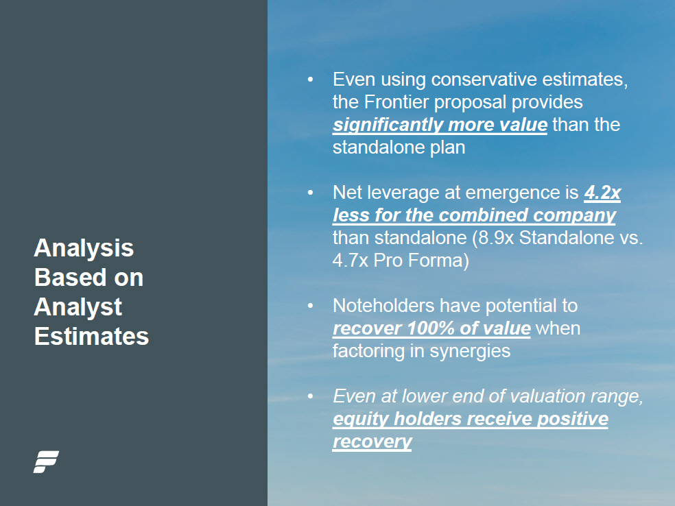 Analysis Based on Analyst Es ti ma t es • Even using conservative estimates, the Frontier proposal provides significantly more value than the standalone plan • Net leverage at emergence is 4.2x less for the combined company than standalone (8.9x Standalone vs. 4.7x Pro Forma) • Noteholders have potential to recover 100 % of value when factoring in synergies • Even at lower end of valuation range, equity holders receive positive recovery