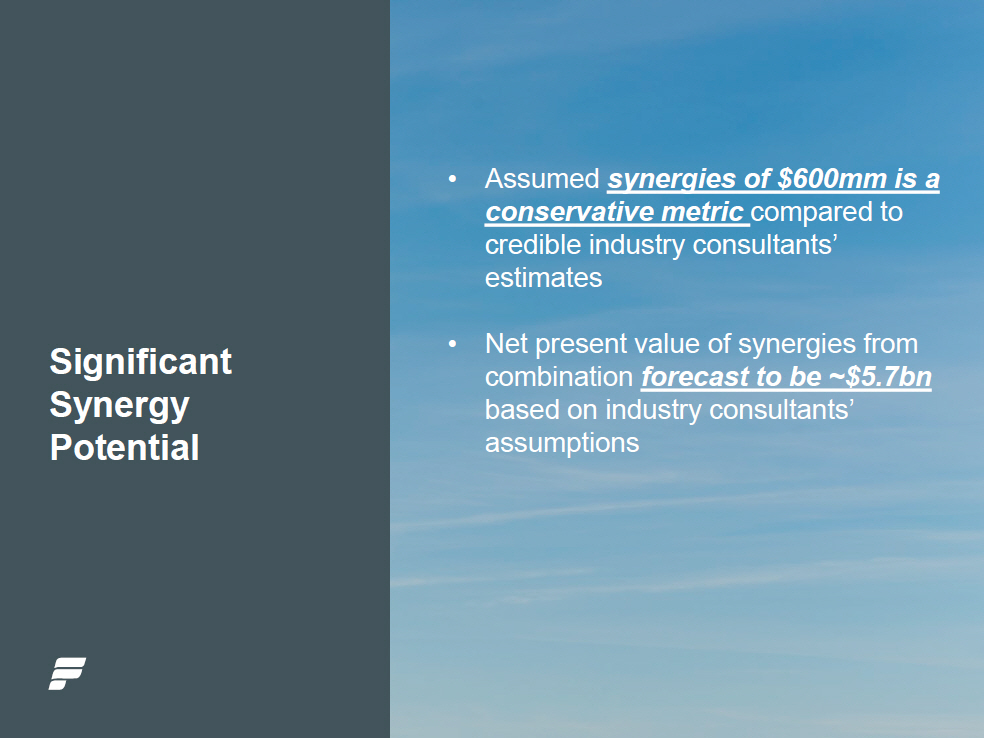 S i gn ifi ca n t Synergy Potential • Assumed synergies of $600mm is a conservative metric compared to credible industry consultants’ estimates • Net present value of synergies from combination forecast to be ~$5.7bn based on industry consultants’ assumptions