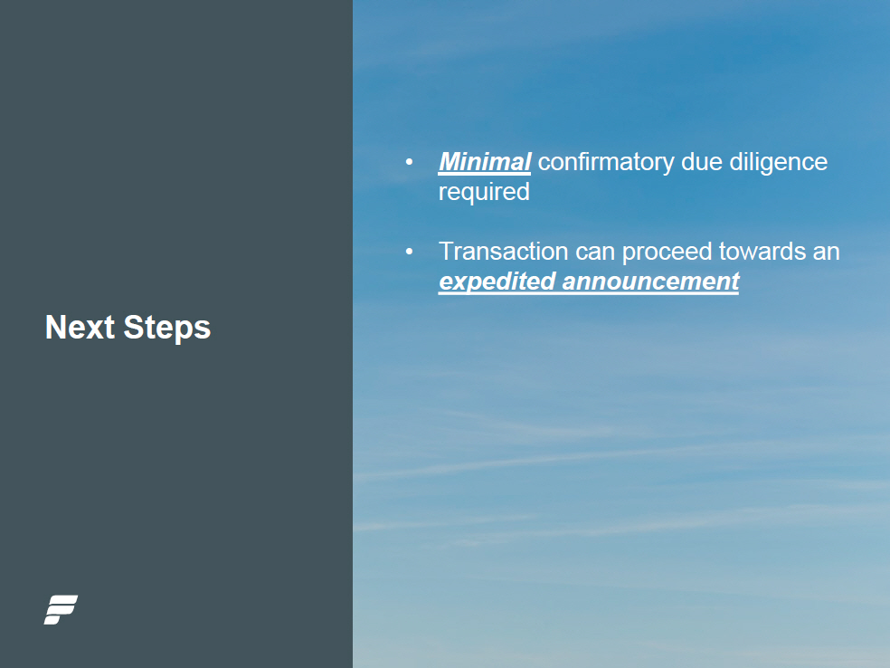 Next Steps • Minimal confirmatory due diligence required • Transaction can proceed towards an expedited announcement