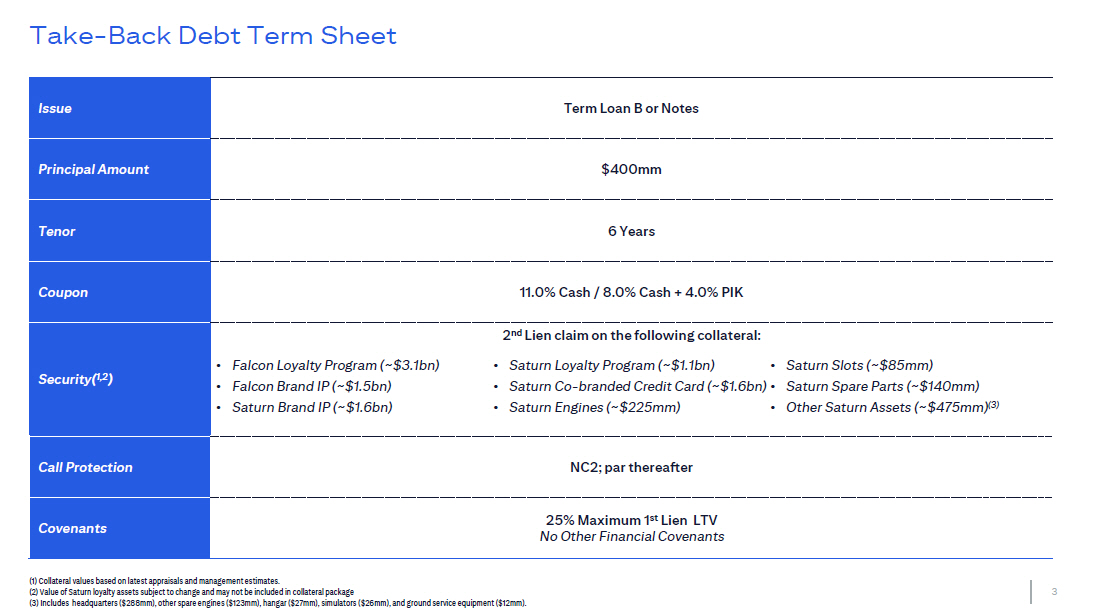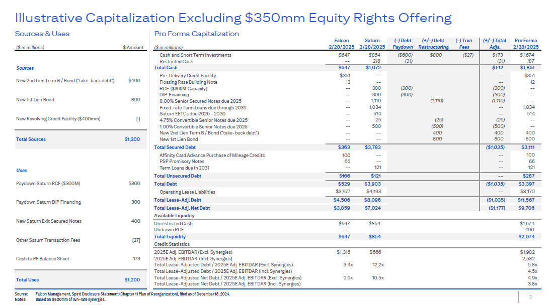 2 Illustrative Capitalization Excluding $350mm Equity Rights Offering S o u r ce : Notes: Falcon Management, Spirit Disclosure Statement (Chapter 11 Plan of Reorganization), filed as of December 18, 2024. Based on $600mm of run - rate synergies. $ 400 Sources New 2nd Lien Term B / Bond ("take - back debt") 800 New 1st Lien Bond [ ] New Revolving Credit Facility ($400mm) $1 ,2 00 Total Sources Uses $3 00 Paydown Saturn RCF ($300M) 3 00 Paydown Saturn DIP Financing 400 New Saturn Exit Secured Notes [ 27 ] Other Saturn Transaction Fees 1 7 3 Cash to PF Balance Sheet $1 ,2 00 Total Uses Pro Forma 2/28/2025 (+/ - ) Total Adjs. ( - ) Trxn F ees (+/ - ) Debt Restructuring ( - ) Debt Paydown Saturn 2/28/2025 Falcon 2/28/2025 ($ in millions) $ 1,6 7 4 $173 ($27) $ 800 ( $ 600) $ 854 $ 647 Cash and Short Term Investments 187 ( 3 1) ( 3 1) 2 18 - - Restricted Cash $1,861 $142 $1 , 072 $ 647 Total Cash $3 51 - - - - $3 51 Pre - Delivery Credit Facility 12 - - - - 12 Floating Rate Building Note - - ( 3 00) ( 3 00) 3 00 - - RCF ($300M Capacity) - - ( 3 00) ( 3 00) 3 00 - - DIP Financing - - (1,110) (1,110) 1,110 - - 8.00% Senior Secured Notes due 2025 1,0 34 - - 1,0 34 - - Fixed - rate Term Loans due through 2039 514 - - 514 - - Saturn EETCs due 2026 - 2030 - - (25) ( 2 5) 25 - - 4.75% Convertible Senior Notes due 2025 - - (500) (500) 500 - - 1.00% Convertible Senior Notes due 2026 400 400 400 - - - - New 2nd Lien Term B / Bond ("take - back debt") 800 800 800 - - - - New 1st Lien Bond $ 3, 111 ($1,035) $ 3, 783 $ 36 3 Total Secured Debt 100 - - - - 100 Affinity Card Advance Purchase of Mileage Credits 66 - - - - 66 PSP Promisory Notes 1 21 - - 1 21 - - Term Loans due in 2031 $ 2 87 -- $1 21 $166 Total Unsecured Debt Total Debt $ 3,39 7 ($1,035) $ 3 ,903 $5 29 $ 8,1 7 0 - - $ 4,193 $3 ,9 7 7 Operating Lease Liabilities $11,567 ($1,035) $8,096 $ 4, 506 Total Lease - Adj. Debt $9,706 ( $1 , 177) $7 , 0 2 4 $ 3, 859 Total Lease - Adj. Net Debt Available Liquidity $ 1,6 7 4 $ 854 $ 647 Unrestricted Cash 400 - - - - Undrawn RCF $ 2, 074 $854 $ 647 Total Liquidity Credit Statistics $ 1,982 $ 666 $ 1, 3 16 2025E Adj. EBITDAR (Excl. Synergies) 2 ,582 2025E Adj. EBITDAR (Incl. Synergies) 5 . 8x 12.2x 3. 4x Total Lease - Adjusted Debt / 2025E Adj. EBITDAR (Excl. Synergies) 4 . 5x Total Lease - Adjusted Debt / 2025E Adj. EBITDAR (Incl. Synergies) 4 . 9x 10.5x 2. 9x Total Lease - Adjusted Net Debt / 2025E Adj. EBITDAR (Excl. Synergies) 3. 8x Total Lease - Adjusted Net Debt / 2025E Adj. EBITDAR (Incl. Synergies) Sources & Uses Pro Forma Capitalization ($ in millions) $ Amount