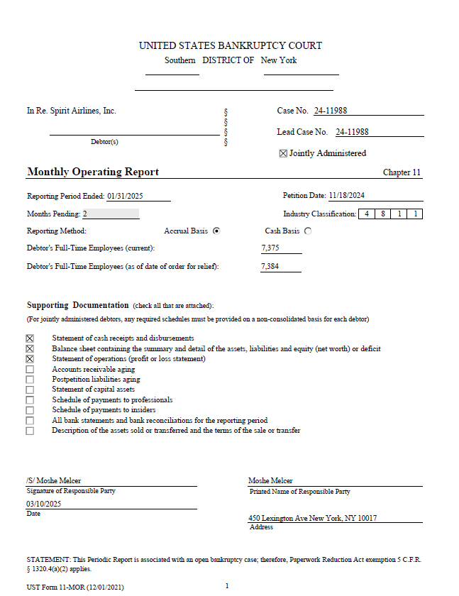 In Re. Spirit Airlines, Inc. Debtor(s) † † † † Case No. 24 - 11988 Lead Case No. 24 - 11988 Jointly Administered Monthly Operating Report Chapter 11 Reporting Period Ended: 01/31/2025 Petition Date: 11/18/2024 Months Pending: 2 1 1 8 4 Industry Classification: Reporting Method: Accrual Basis Cash Basis Debtor's Full - Time Employees (current): 7,375 Debtor's Full - Time Employees (as of date of order for relief): 7,384 Supporting Documentation (check all that are attached): (For jointly administered debtors, any required schedules must be provided on a non - consolidated basis for each debtor) Statement of cash receipts and disbursements Balance sheet containing the summary and detail of the assets, liabilities and equity (net worth) or deficit Statement of operations (profit or loss statement) Accounts receivable aging Postpetition liabilities aging Statement of capital assets Schedule of payments to professionals Schedule of payments to insiders All bank statements and bank reconciliations for the reporting period Description of the assets sold or transferred and the terms of the sale or transfer Printed Name of Responsible Party Date /S/ Moshe Melcer Signature of Responsible Party 03/10/2025 Moshe Melcer 1 UST Form 11 - MOR (12/01/2021) 450 Lexington Ave New York, NY 10017 Address STATEMENT: This Periodic Report is associated with an open bankruptcy case; therefore, Paperwork Reduction Act exemption 5 C.F.R. † 1320.4(a)(2) applies. UNITED STATES BANKRUPTCY COURT Southern DISTRICT OF New York