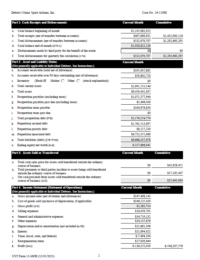 Debtor's Name Spirit Airlines, Inc. Case No. 24 - 11988 Part 1: Cash Receipts and Disbursements Current Month Cumulative $1,145,082,912 $407,809,931 $1,432,963,116 $532,070,707 $1,292,663,295 $1,020,822,136 $0 $532,070,707 $0 a. Cash balance beginning of month b. Total receipts (net of transfers between accounts) c. Total disbursements (net of transfers between accounts) d. Cash balance end of month (a+b - c) e. Disbursements made by third party for the benefit of the estate f. Total disbursements for quarterly fee calculation (c+e) $1,292,663,295 Current Month Part 2: Asset and Liability Status (Not generally applicable to Individual Debtors. See Instructions.) $195,635,881 $59,802,710 (attach explanation)) $0 $1,991,553,146 $9,450,441,637 $1,071,377,944 $3,406,438 $104,876,830 $0 $1,176,254,774 $1,761,513,997 $8,217,239 $6,722,351,668 $9,668,337,678 a. Accounts receivable (total net of allowance) b. Accounts receivable over 90 days outstanding (net of allowance) c. d e. f. g. h. i. j. k. l. m. n. o. Inventory ( Book Market Other Total current assets Total assets Postpetition payables (excluding taxes) Postpetition payables past due (excluding taxes) Postpetition taxes payable Postpetition taxes past due Total postpetition debt (f+h) Prepetition secured debt Prepetition priority debt Prepetition unsecured debt Total liabilities (debt) (j+k+l+m) Ending equity/net worth (e - n) $ - 217,896,041 Part 3: Assets Sold or Transferred Current Month Cumulative $0 $42,828,451 $0 $17,185,447 c. a. Total cash sales price for assets sold/transferred outside the ordinary course of business b. Total payments to third parties incident to assets being sold/transferred outside the ordinary course of business Net cash proceeds from assets sold/transferred outside the ordinary course of business (a - b) $0 $25,643,004 Cumulative Current Month Part 4: Income Statement (Statement of Operations) (Not generally applicable to Individual Debtors. See Instructions.) $347,408,143 a. Gross income/sales (net of returns and allowances) $346,125,429 b. Cost of goods sold (inclusive of depreciation, if applicable) $1,282,714 c. Gross profit (a - b) $18,459,705 d. Selling expenses $34,719,132 e. General and administrative expenses $34,135,856 f. Other expenses $21,681,398 g. Depreciation and/or amortization (not included in 4b) $21,094,022 h. Interest $ - 7,494,104 i. Taxes (local, state, and federal) $17,039,644 j. Reorganization items $ - 548,207,576 $ - 138,352,939 k. Profit (loss) 2 UST Form 11 - MOR (12/01/2021)