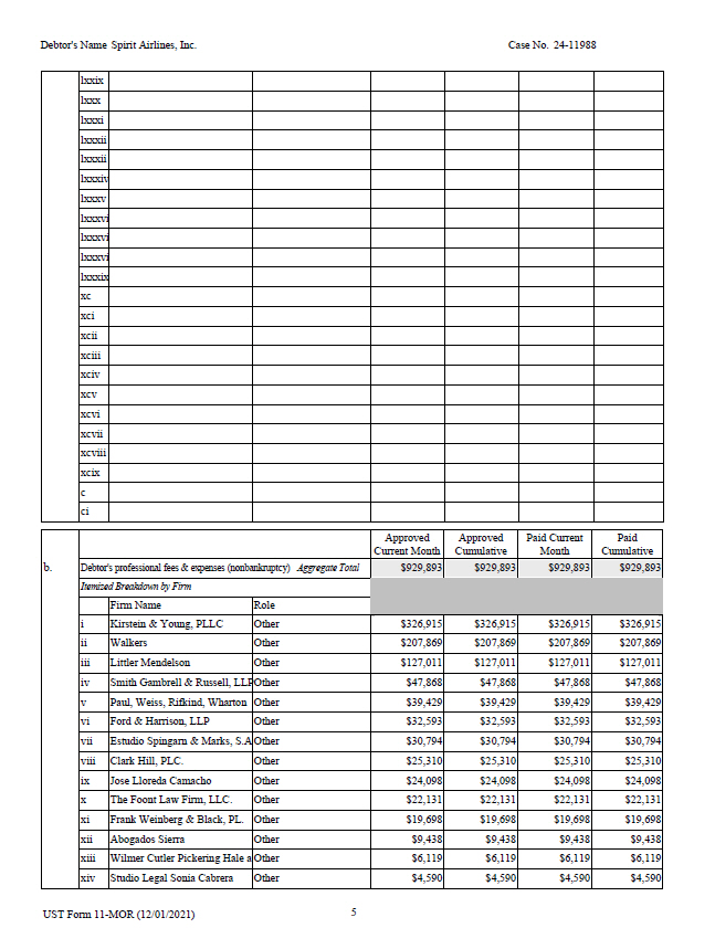 5 UST Form 11 - MOR (12/01/2021) Debtor's Name Spirit Airlines, Inc. Case No. 24 - 11988 lxxix lxxx lxxxi lxxxii lxxxii lxxxiv lxxxv lxxxvi lxxxvi lxxxvi lxxxix xc xci xcii xciii xciv xcv xcvi xcvii xcviii xcix c ci Paid Cumulative Paid Current Month Approved Cumulative Approved Current Month b. $929,893 $929,893 $929,893 $929,893 Debtor's professional fees & expenses (nonbankruptcy) Aggregate Total Itemized Breakdown by Firm Role Firm Name $326,915 $326,915 $326,915 $326,915 Other Kirstein & Young, PLLC i $207,869 $207,869 $207,869 $207,869 Other Walkers ii $127,011 $127,011 $127,011 $127,011 Other Littler Mendelson iii $47,868 $47,868 $47,868 $47,868 Other Smith Gambrell & Russell, LLP iv $39,429 $39,429 $39,429 $39,429 Other Paul, Weiss, Rifkind, Wharton v $32,593 $32,593 $32,593 $32,593 Other Ford & Harrison, LLP vi $30,794 $30,794 $30,794 $30,794 Other Estudio Spingarn & Marks, S.A vii $25,310 $25,310 $25,310 $25,310 Other Clark Hill, PLC. viii $24,098 $24,098 $24,098 $24,098 Other Jose Lloreda Camacho ix $22,131 $22,131 $22,131 $22,131 Other The Foont Law Firm, LLC. x $19,698 $19,698 $19,698 $19,698 Other Frank Weinberg & Black, PL. xi $9,438 $9,438 $9,438 $9,438 Other Abogados Sierra xii $6,119 $6,119 $6,119 $6,119 Other Wilmer Cutler Pickering Hale a xiii $4,590 $4,590 $4,590 $4,590 Other Studio Legal Sonia Cabrera xiv