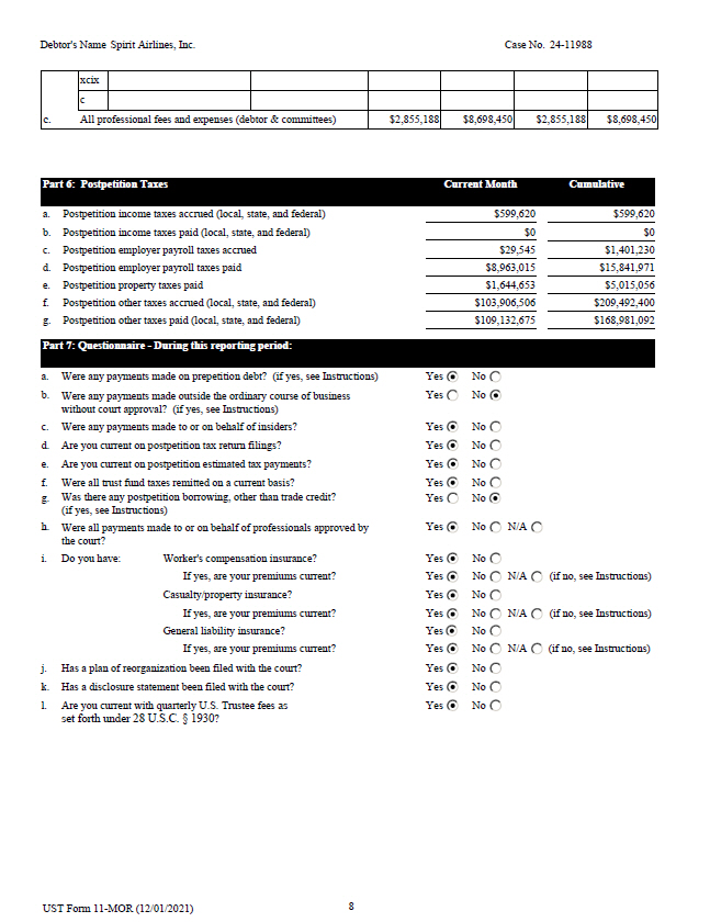 Debtor's Name Spirit Airlines, Inc. Case No. 24 - 11988 xcix c $8,698,450 $2,855,188 $8,698,450 $2,855,188 c. All professional fees and expenses (debtor & committees) Part 6: Postpetition Taxes Current Month Cumulative $599,620 $599,620 a. Postpetition income taxes accrued (local, state, and federal) $0 $0 b. Postpetition income taxes paid (local, state, and federal) $1,401,230 $29,545 c. Postpetition employer payroll taxes accrued $15,841,971 $8,963,015 d. Postpetition employer payroll taxes paid $5,015,056 $1,644,653 e. Postpetition property taxes paid $209,492,400 $103,906,506 f. Postpetition other taxes accrued (local, state, and federal) $168,981,092 $109,132,675 g. Postpetition other taxes paid (local, state, and federal) Part 7: Questionnaire - During this reporting period: Yes Yes No No Yes Yes Yes Yes Yes No No No No No h. a. Were any payments made on prepetition debt? (if yes, see Instructions) b. Were any payments made outside the ordinary course of business without court approval? (if yes, see Instructions) c. Were any payments made to or on behalf of insiders? d. Are you current on postpetition tax return filings? e. Are you current on postpetition estimated tax payments? f. Were all trust fund taxes remitted on a current basis? g. Was there any postpetition borrowing, other than trade credit? (if yes, see Instructions) Were all payments made to or on behalf of professionals approved by the court? Yes No N/A i. Do you have: N/A (if no, see Instructions) N/A (if no, see Instructions) Worker's compensation insurance? If yes, are your premiums current? Casualty/property insurance? If yes, are your premiums current? General liability insurance? If yes, are your premiums current? N/A (if no, see Instructions) j. Has a plan of reorganization been filed with the court? k. Has a disclosure statement been filed with the court? l. Are you current with quarterly U.S. Trustee fees as set forth under 28 U.S.C. † 1930 ? Yes Yes Yes Yes Yes Yes Yes Yes Yes No No No No No No No No No 8 UST Form 11 - MOR (12/01/2021)