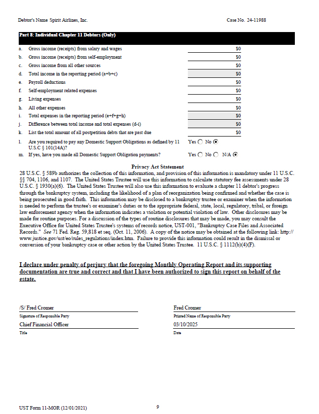 Debtor's Name Spirit Airlines, Inc. Case No. 24 - 11988 Part 8: Individual Chapter 11 Debtors (Only) $0 $0 $0 $0 $0 $0 $0 $0 $0 $0 $0 Yes No Yes No N/A a. Gross income (receipts) from salary and wages b. Gross income (receipts) from self - employment c. Gross income from all other sources d. Total income in the reporting period (a+b+c) e. Payroll deductions f. Self - employment related expenses g. Living expenses h. All other expenses i. Total expenses in the reporting period (e+f+g+h) j. Difference between total income and total expenses (d - i) k. List the total amount of all postpetition debts that are past due l. Are you required to pay any Domestic Support Obligations as defined by 11 U.S.C † 101(14A)? m. If yes, have you made all Domestic Support Obligation payments? Privacy Act Statement 28 U.S.C. † 589b authorizes the collection of this information, and provision of this information is mandatory under 11 U.S.C. †† 704, 1106, and 1107. The United States Trustee will use this information to calculate statutory fee assessments under 28 U.S.C. † 1930(a)(6). The United States Trustee will also use this information to evaluate a chapter 11 debtor's progress through the bankruptcy system, including the likelihood of a plan of reorganization being confirmed and whether the case is being prosecuted in good faith. This information may be disclosed to a bankruptcy trustee or examiner when the information is needed to perform the trustee's or examiner's duties or to the appropriate federal, state, local, regulatory, tribal, or fore ign law enforcement agency when the information indicates a violation or potential violation of law. Other disclosures may be made for routine purposes. For a discussion of the types of routine disclosures that may be made, you may consult the Executive Office for United States Trustee's systems of records notice, UST - 001, "Bankruptcy Case Files and Associated Records." See 71 Fed. Reg. 59,818 et seq. (Oct. 11, 2006). A copy of the notice may be obtained at the following link: http:// www.justice.gov/ust/eo/rules_regulations/index.htm. Failure to provide this information could result in the dismissal or conversion of your bankruptcy case or other action by the United States Trustee. 11 U.S.C. † 1112(b)(4)(F). I declare under penalty of perjury that the foregoing Monthly Operating Report and its supporting documentation are true and correct and that I have been authorized to sign this report on behalf of the estate. /S/ Fred Cromer Signature of Responsible Party Chief Financial Officer Printed Name of Responsible Party 03/10/2025 Date Title Fred Cromer 9 UST Form 11 - MOR (12/01/2021)