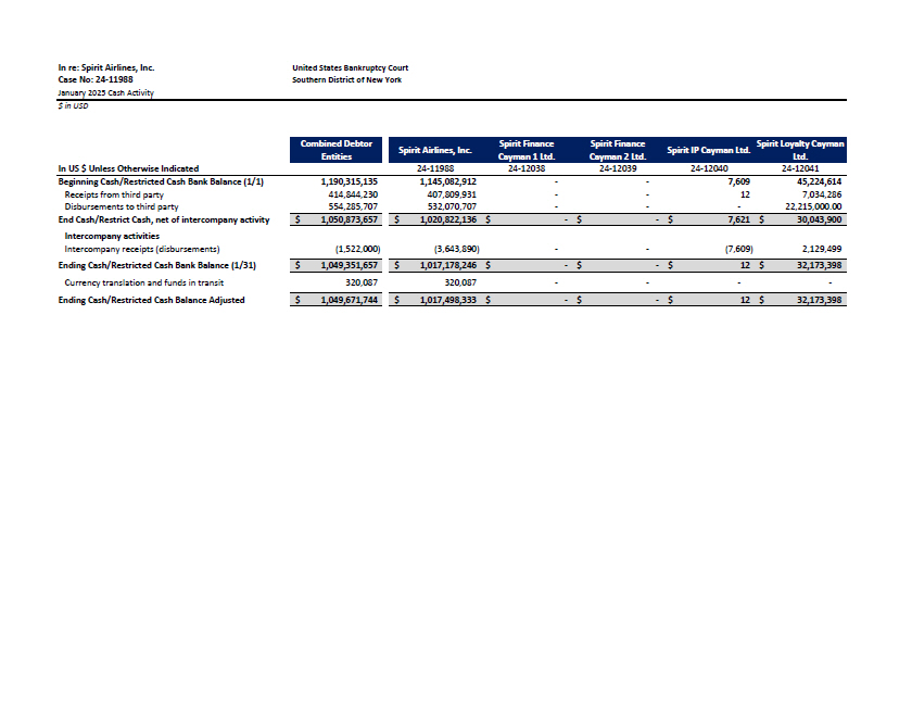 United States Bankruptcy Court Southern District of New York In re: Spirit Airlines, Inc. Case No: 24 - 11988 January 2025 Cash Activity $ in USD Combined Debtor Entities Spirit Airlines, Inc. Spirit Finance Cayman 1 Ltd. Spirit Finance Cayman 2 Ltd. Spirit IP Cayman Ltd. Spirit Loyalty Cayman Ltd. In US $ Unless Otherwise Indicated 24 - 11988 24 - 12038 24 - 12039 24 - 12040 24 - 12041 320,087 320,087 - - - - Currency translation and funds in transit Ending Cash/Restricted Cash Balance Adjusted $ 1,049,671,7 4 4 $ 1,017,498,333 $ - $ - $ 32,173,398 12 $ 45,224,614 7,609 - - 1,145,082,912 1,190,315,135 Beginning Cash/Restricted Cash Bank Balance (1/1) 7,034,286 - - 12 407,809,931 414,844,230 Receipts from third party 22,215,000.00 - - - 532,070,707 554,285,707 Disbursements to third party $ 30,043,900 7,621 - $ - $ $ $ 1,020,822,136 $ 1,050,873,657 End Cash/Restrict Cash, net of intercompany activity 2,129,499 (7,609) - - (3,643,890) (1,522,000) Intercompany activities Intercompany receipts (disbursements) $ 32,173,398 12 - $ - $ $ $ 1,017,178,246 $ 1,049,351,657 Ending Cash/Restricted Cash Bank Balance (1/31)