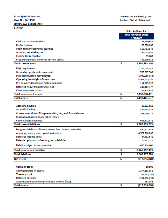United States Bankruptcy Court Southern District of New York In re: Spirit Airlines, Inc. Case No: 24 - 11988 January 2025 Balance Sheet $ in USD Spirit Airlines, Inc. Total for Period Ended 1/31/2025 Cash and cash equivalents Restricted cash Short - term investment securities Accounts receivable, net Income tax receivable Prepaid expenses and other current assets 773,750,648 155,028,267 118,752,548 195,635,881 95,889 748,289,913 $ Total current assets Flight equipment Ground property and equipment Less accumulated depreciation Operating lease right - of - use assets Pre - delivery deposits on flight equipment Deferred heavy maintenance, net Other long - term assets 1,991,553,146 2,737,083,347 786,217,509 (1,040,865,853) 4,562,655,532 114,875,927 240,417,477 58,504,552 Total non - current assets 7,458,888,491 $ Total assets 9,450,441,637 $ 38,382,828 452,683,486 309,516,573 - Accounts payable Air traffic liability Current maturities of long - term debt, net, and finance leases Current maturities of operating leases Other current liabilities 601,572,378 Total current liabilities 1,402,155,265 $ 1,890,707,929 4,571,710,267 44,432,641 124,227,576 Long - term debt and finance leases, less current maturities operating leases, less current maturities Deferred income taxes Deferred gains and other long - term liabilities Liability subject to compromise 1,635,104,000 Total non - current liabilities 8,266,182,413 $ Total liabilities 9,668,337,678 $ Net assets (217,896,040) $ Common stock Additional paid - in - capital Treasury stock Retained earnings Accumulated other comprehensive income (loss) 10,900 1,174,313,551 (81,285,357) (1,311,092,220) 157,086 Total equity (217,896,040) $