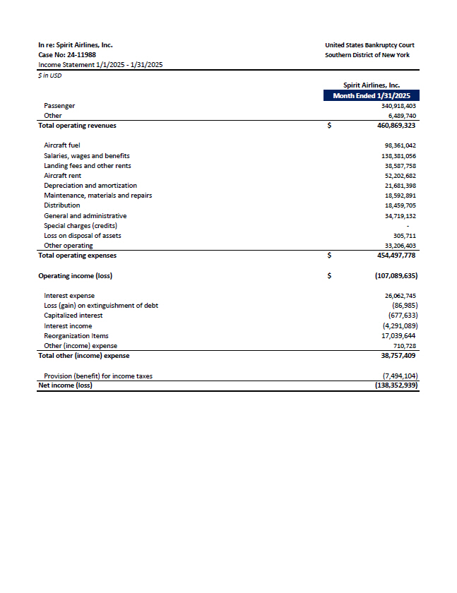 United States Bankruptcy Court Southern District of New York In re: Spirit Airlines, Inc. Case No: 24 - 11988 Income Statement 1/1/2025 - 1/31/2025 $ in USD Spirit Airlines, Inc. Month Ended 1/31/2025 340,918,403 Passenger 6,489,740 Other $ 460,869,323 Total operating revenues 98,361,042 Aircraft fuel 138,381,056 Salaries, wages and benefits 38,587,758 Landing fees and other rents 52,202,682 Aircraft rent 21,681,398 Depreciation and amortization 18,592,891 Maintenance, materials and repairs 18,459,705 Distribution 34,719,132 General and administrative - Special charges (credits) 305,711 Loss on disposal of assets 33,206,403 Other operating $ 454,497,778 Total operating expenses $ (107,089,635) Operating income (loss) 26,062,745 Interest expense (86,985) Loss (gain) on extinguishment of debt (677,633) Capitalized interest (4,291,089) Interest income 17,039,644 Reorganization Items 710,728 Other (income) expense 38,757,409 Total other (income) expense (7,494,104) Provision (benefit) for income taxes (138,352,939) Net income (loss)