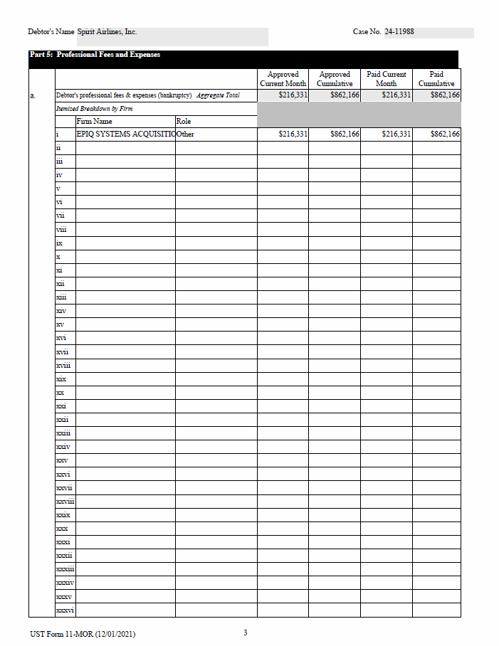 3 UST Form 11 - MOR (12/01/2021) Debtor's Name Spirit Airlines, Inc. Case No. 24 - 11988 Part 5: Professional Fees and Expenses Paid Cumulative Paid Current Month Approved Cumulative Approved Current Month a. $862,166 $216,331 $862,166 $216,331 Debtor's professional fees & expenses (bankruptcy) Aggregate Total Itemized Breakdown by Firm Role Firm Name $862,166 $216,331 $862,166 $216,331 Other EPIQ SYSTEMS ACQUISITIO i ii iii iv v vi vii viii ix x xi xii xiii xiv xv xvi xvii xviii xix xx xxi xxii xxiii xxiv xxv xxvi xxvii xxviii xxix xxx xxxi xxxii xxxiii xxxiv xxxv xxxvi