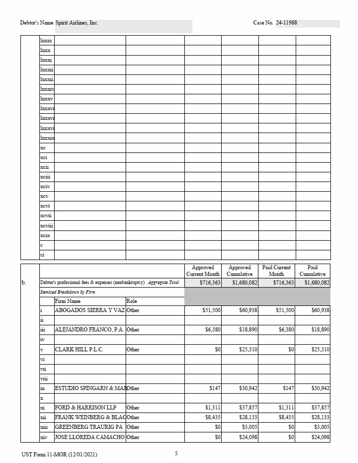 5 UST Form 11 - MOR (12/01/2021) Debtor's Name Spirit Airlines, Inc. Case No. 24 - 11988 lxxix lxxx lxxxi lxxxii lxxxii lxxxi v lxxxv lxxxv i lxxxv i lxxxv i lxxxi x xc xci xcii xciii xciv xcv xcvi xcvii xcviii xcix c ci Paid Cumulative Paid Current Month Approved Cumulative Approved Current Month b. $1,680,082 $716,363 $1,680,082 $716,363 Debtor's professional fees & expenses (nonbankruptcy) Aggregate Total Itemized Breakdown by Firm Role Firm Name $60,938 $51,500 $60,938 $51,500 Other ABOGADOS SIERRA Y VAZ i ii $18,890 $6,380 $18,890 $6,380 Other ALEJANDRO FRANCO, P.A. iii iv $25,310 $0 $25,310 $0 Other CLARK HILL P.L.C. v vi vii viii $30,942 $147 $30,942 $147 Other ESTUDIO SPINGARN & MAR ix x $37,857 $1,311 $37,857 $1,311 Other FORD & HARRISON LLP xi $28,133 $8,435 $28,133 $8,435 Other FRANK WEINBERG & BLAC xii $3,005 $0 $3,005 $0 Other GREENBERG TRAURIG PA xiii $24,098 $0 $24,098 $0 Other JOSE LLOREDA CAMACHO xiv