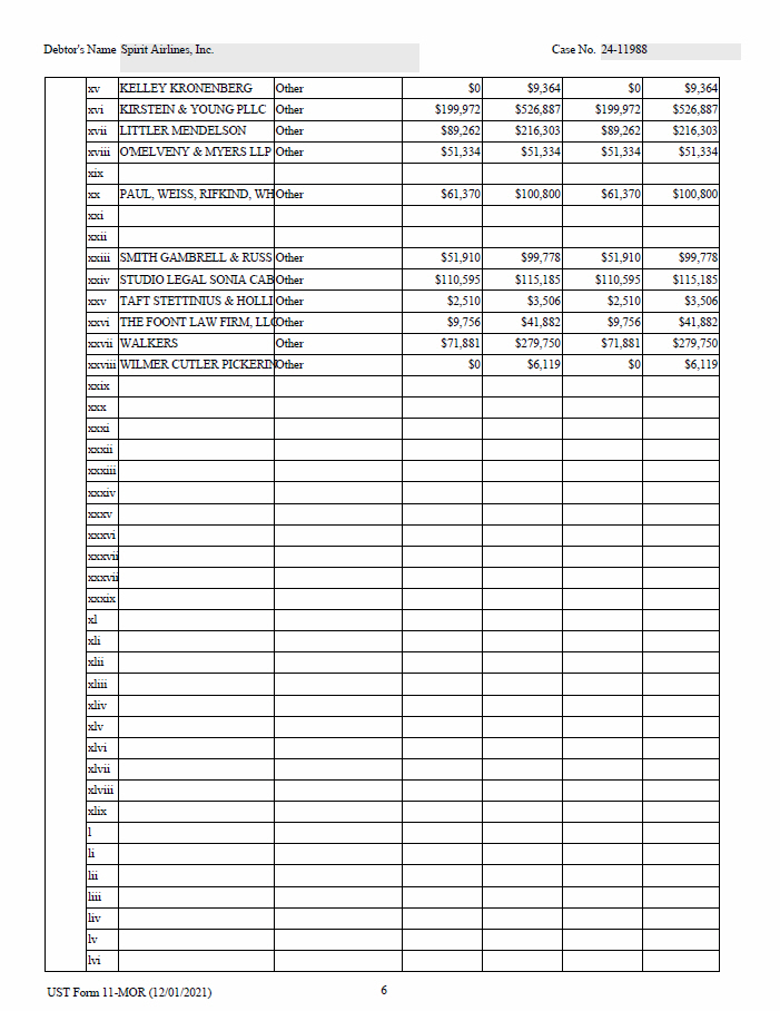 6 UST Form 11 - MOR (12/01/2021) Debtor's Name Spirit Airlines, Inc. Case No. 24 - 11988 $9,364 $0 $9,364 $0 Other KELLEY KRONENBERG xv $526,887 $199,972 $526,887 $199,972 Other KIRSTEIN & YOUNG PLLC xvi $216,303 $89,262 $216,303 $89,262 Other LITTLER MENDELSON xvii $51,334 $51,334 $51,334 $51,334 Other O'MELVENY & MYERS LLP xviii xix $100,800 $61,370 $100,800 $61,370 Other PAUL, WEISS, RIFKIND, WH xx xxi xxii $99,778 $51,910 $99,778 $51,910 Other SMITH GAMBRELL & RUSS xxiii $115,185 $110,595 $115,185 $110,595 Other STUDIO LEGAL SONIA CAB xxiv $3,506 $2,510 $3,506 $2,510 Other TAFT STETTINIUS & HOLLI xxv $41,882 $9,756 $41,882 $9,756 Other THE FOONT LAW FIRM, LLC xxvi $279,750 $71,881 $279,750 $71,881 Other WALKERS xxvii $6,119 $0 $6,119 $0 Other WILMER CUTLER PICKERIN xxviii xxix xxx xxxi xxxii xxxiii xxxiv xxxv xxxvi xxxvi i xxxvi i xxxix xl xli xlii xliii xliv xlv xlvi xlvii xlviii xlix l li lii liii liv lv lvi