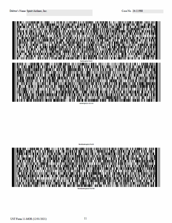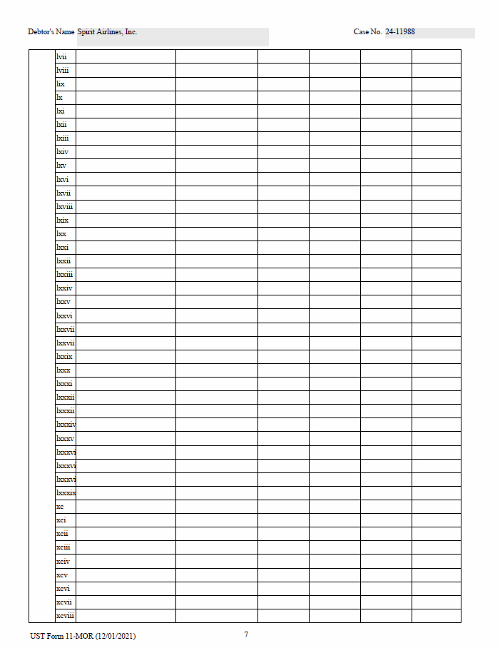 7 UST Form 11 - MOR (12/01/2021) Debtor's Name Spirit Airlines, Inc. Case No. 24 - 11988 lvii lviii lix lx lxi lxii lxiii lxiv lxv lxvi lxvii lxviii lxix lxx lxxi lxxii lxxiii lxxiv lxxv lxxvi lxxvii lxxvii lxxix lxxx lxxxi lxxxii lxxxii lxxxi v lxxxv lxxxv i lxxxv i lxxxv i lxxxi x xc xci xcii xciii xciv xcv xcvi xcvii xcviii