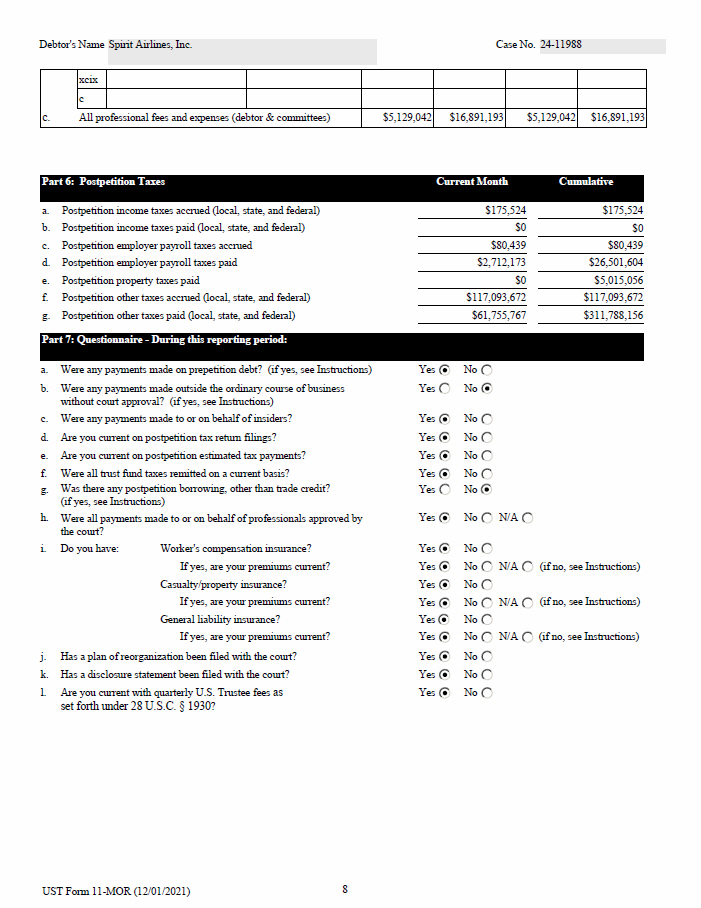 Debtor's Name Spirit Airlines, Inc. Case No. 24 - 11988 xcix c $16,891,193 $5,129,042 $16,891,193 $5,129,042 c. All professional fees and expenses (debtor & committees) Part 6: Postpetition Taxes Current Month Cumulative $175,524 $175,524 a. Postpetition income taxes accrued (local, state, and federal) $0 $0 b. Postpetition income taxes paid (local, state, and federal) $80,439 $80,439 c. Postpetition employer payroll taxes accrued $26,501,604 $2,712,173 d. Postpetition employer payroll taxes paid $5,015,056 $0 e. Postpetition property taxes paid $117,093,672 $117,093,672 f. Postpetition other taxes accrued (local, state, and federal) $311,788,156 $61,755,767 g. Postpetition other taxes paid (local, state, and federal) Part 7: Questionnaire - During this reporting period: Yes Yes No No Yes Yes Yes Yes Yes No No No No No h. a. Were any payments made on prepetition debt? (if yes, see Instructions) b. Were any payments made outside the ordinary course of business without court approval? (if yes, see Instructions) c. Were any payments made to or on behalf of insiders? d. Are you current on postpetition tax return filings? e. Are you current on postpetition estimated tax payments? f. Were all trust fund taxes remitted on a current basis? g. Was there any postpetition borrowing, other than trade credit? (if yes, see Instructions) Were all payments made to or on behalf of professionals approved by the court? Yes No N/A i. Do you have: N/A (if no, see Instructions) N/A (if no, see Instructions) Worker's compensation insurance? If yes, are your premiums current? Casualty/property insurance? If yes, are your premiums current? General liability insurance? If yes, are your premiums current? N/A (if no, see Instructions) j. Has a plan of reorganization been filed with the court? k. Has a disclosure statement been filed with the court? l. Are you current with quarterly U.S. Trustee fees as set forth under 28 U.S.C. † 1930 ? Yes Yes Yes Yes Yes Yes Yes Yes Yes No No No No No No No No No 8 UST Form 11 - MOR (12/01/2021)