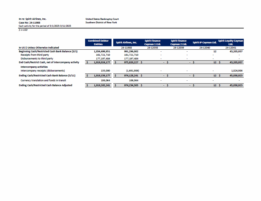 United States Bankruptcy Court Southern District of New York In re: Spirit Airlines, Inc. Case No: 24 - 11988 Cash activity for the period of 3/1/2025 - 3/11/2025 $ in USD Combined Debtor Spirit Airlines, Inc. Spirit Finance Spirit Finance Spirit IP Cayman Ltd. Spirit Loyalty Cayman Ltd. 24 - 12041 24 - 12040 Cayman 2 Ltd. 24 - 12039 Cayman 1 Ltd. 24 - 12038 24 - 11988 Entities In US $ Unless Otherwise Indicated 43,203,937 12 - - 991,296,002 1,034,499,951 Beginning Cash/Restricted Cash Bank Balance (3/1) - - - - 161,721,710 161,721,710 Receipts from third party - - - - 177,197,484 177,197,484 Disbursements to third party - $ - $ 12 $ 43,203,937 $ $ 975,820,227 $ 1,019,024,177 End Cash/Restrict Cash, net of intercompany activity - - - 1,826,986 (1,691,986) 135,000 Intercompany activities Intercompany receipts (disbursements) - $ - $ 12 $ 45,030,923 $ $ 974,128,241 $ 1,019,159,177 Ending Cash/Restricted Cash Bank Balance (3/11) - - - - 106,064 106,064 Currency translation and funds in transit - $ - $ 12 $ 45,030,923 $ $ 974,234,305 $ 1,019,265,241 Ending Cash/Restricted Cash Balance Adjusted