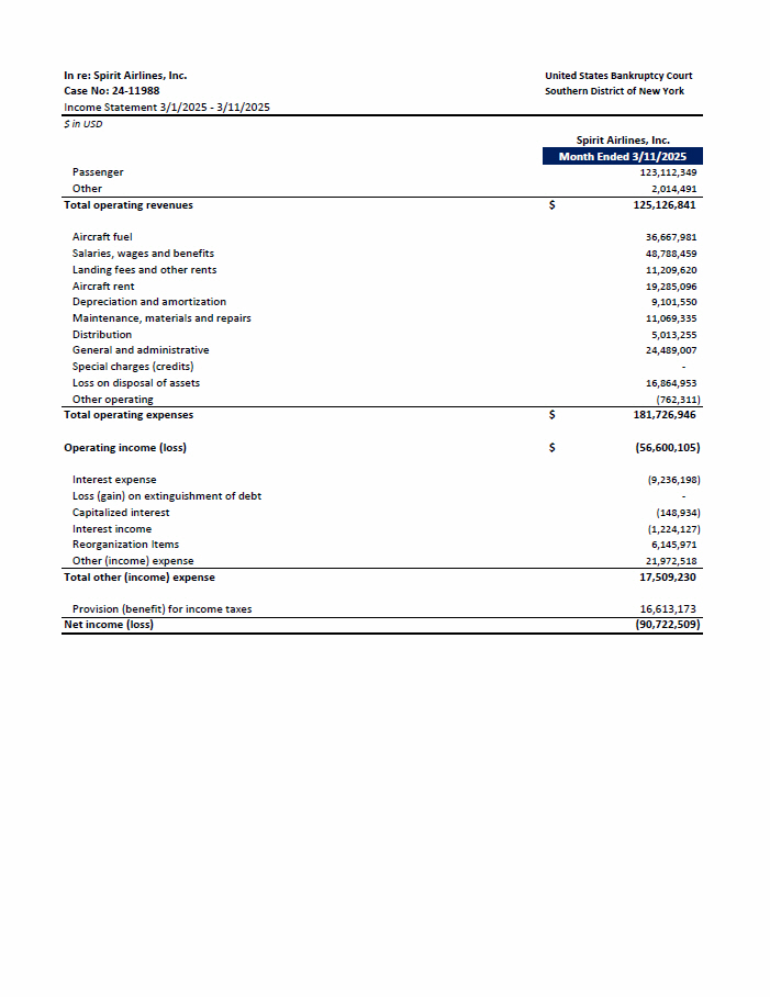 United States Bankruptcy Court Southern District of New York In re: Spirit Airlines, Inc. Case No: 24 - 11988 Income Statement 3/1/2025 - 3/11/2025 $ in USD Spirit Airlines, Inc. Month Ended 3/11/2025 123,112,349 Passenger 2,014,491 Other $ 125,126,841 Total operating revenues 36,667,981 Aircraft fuel 48,788,459 Salaries, wages and benefits 11,209,620 Landing fees and other rents 19,285,096 Aircraft rent 9,101,550 Depreciation and amortization 11,069,335 Maintenance, materials and repairs 5,013,255 Distribution 24,489,007 General and administrative - Special charges (credits) 16,864,953 Loss on disposal of assets (762,311) Other operating $ 181,726,946 Total operating expenses $ (56,600,105) Operating income (loss) (9,236,198) Interest expense - Loss (gain) on extinguishment of debt (148,934) Capitalized interest (1,224,127) Interest income 6,145,971 Reorganization Items 21,972,518 Other (income) expense 17,509,230 Total other (income) expense 16,613,173 Provision (benefit) for income taxes (90,722,509) Net income (loss)