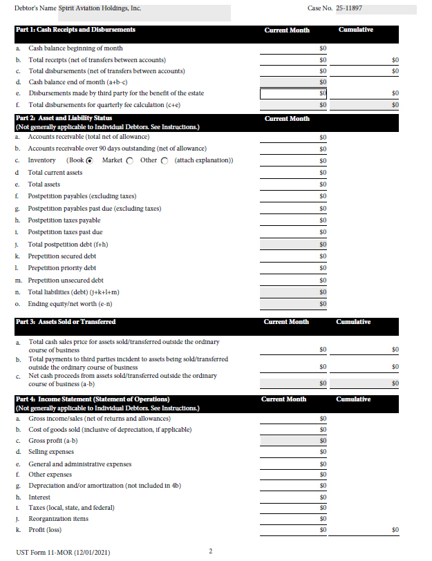 Debtor's Name Spirit Aviation Holdings, Inc. Case No. 25 - 11897 Part 1: Cash Receipts and Disbursements Current Month Cumulative $0 $0 $0 $0 $0 $0 $0 $0 $0 a. Cash balance beginning of month b. Total receipts (net of transfers between accounts) c. Total disbursements (net of transfers between accounts) d. Cash balance end of month (a+b - c) e. Disbursements made by third party for the benefit of the estate f. Total disbursements for quarterly fee calculation (c+e) $0 Current Month Part 2: Asset and Liability Status (Not generally applicable to Individual Debtors. See Instructions.) $0 $0 a. Accounts receivable (total net of allowance) b. Accounts receivable over 90 days outstanding (net of allowance) c. Inventory (Book Market Other (attach explanation)) $0 Total current assets d $0 Total assets e. $0 Postpetition payables (excluding taxes) f. $0 Postpetition payables past due (excluding taxes) g. $0 Postpetition taxes payable h. $0 Postpetition taxes past due i. $0 Total postpetition debt (f+h) j. $0 Prepetition secured debt k. $0 Prepetition priority debt l. $0 Prepetition unsecured debt m. $0 Total liabilities (debt) (j+k+l+m) n. $0 Ending equity/net worth (e - n) o. $0 Part 3: Assets Sold or Transferred Current Month Cumulative $0 $0 a. Total cash sales price for assets sold/transferred outside the ordinary course of business $0 $0 b. Total payments to third parties incident to assets being sold/transferred outside the ordinary course of business c. Net cash proceeds from assets sold/transferred outside the ordinary $0 $0 course of business (a - b) Cumulative Current Month Part 4: Income Statement (Statement of Operations) (Not generally applicable to Individual Debtors. See Instructions.) $0 a. Gross income/sales (net of returns and allowances) $0 b. Cost of goods sold (inclusive of depreciation, if applicable) $0 c. Gross profit (a - b) $0 d. Selling expenses $0 e. General and administrative expenses $0 f. Other expenses $0 g. Depreciation and/or amortization (not included in 4b) $0 h. Interest $0 i. Taxes (local, state, and federal) $0 j. Reorganization items $0 $0 k. Profit (loss) 2 UST Form 11 - MOR (12/01/2021)