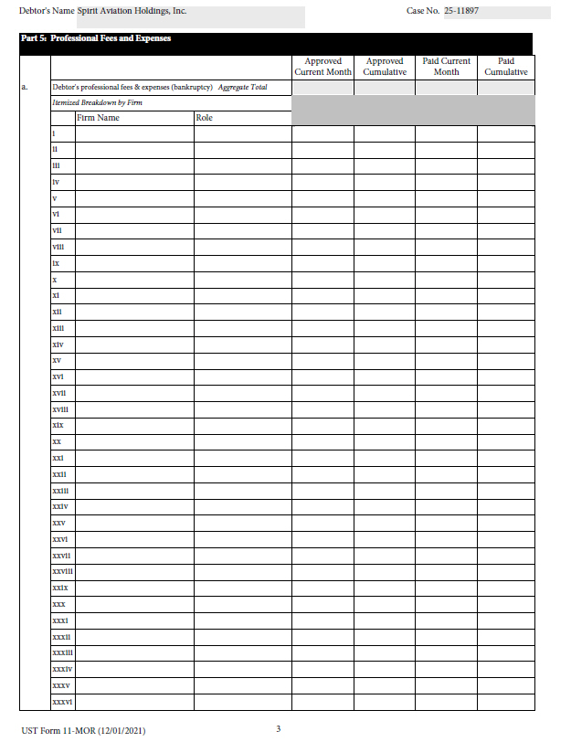 3 UST Form 11 - MOR (12/01/2021) Debtor's Name Spirit Aviation Holdings, Inc. Case No. 25 - 11897 Part 5: Professional Fees and Expenses Paid Cumulative Paid Current Month Approved Cumulative Approved Current Month a. Debtor's professional fees & expenses (bankruptcy) Aggregate Total Itemized Breakdown by Firm Role Firm Name i ii iii iv v vi vii viii ix x xi xii xiii xiv xv xvi xvii xviii xix xx xxi xxii xxiii xxiv xxv xxvi xxvii xxviii xxix xxx xxxi xxxii xxxiii xxxiv xxxv xxxvi