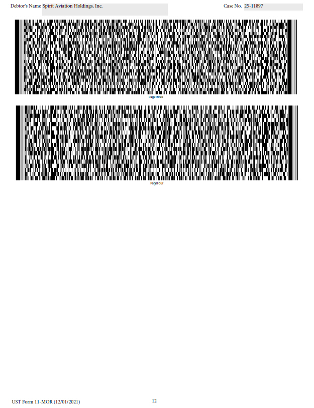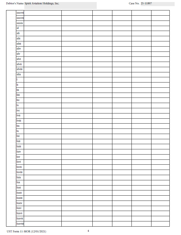 4 UST Form 11 - MOR (12/01/2021) Debtor's Name Spirit Aviation Holdings, Inc. Case No. 25 - 11897 xxxvii xxxvii xxxix xl xli xlii xliii xliv xlv xlvi xlvii xlviii xlix l li lii liii liv lv lvi lvii lviii lix lx lxi lxii lxiii lxiv lxv lxvi lxvii lxviii lxix lxx lxxi lxxii lxxiii lxxiv lxxv lxxvi lxxvii lxxviii