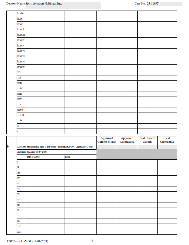 5 UST Form 11 - MOR (12/01/2021) Debtor's Name Spirit Aviation Holdings, Inc. Case No. 25 - 11897 lxxix lxxx lxxxi lxxxii lxxxiii lxxxiv lxxxv lxxxvi lxxxvi lxxxvi lxxxix xc xci xcii xciii xciv xcv xcvi xcvii xcviii xcix c ci Paid Cumulative Paid Current Month Approved Cumulative Approved Current Month b. Debtor's professional fees & expenses (nonbankruptcy) Aggregate Total Itemized Breakdown by Firm Role Firm Name i ii iii iv v vi vii viii ix x xi xii xiii xiv